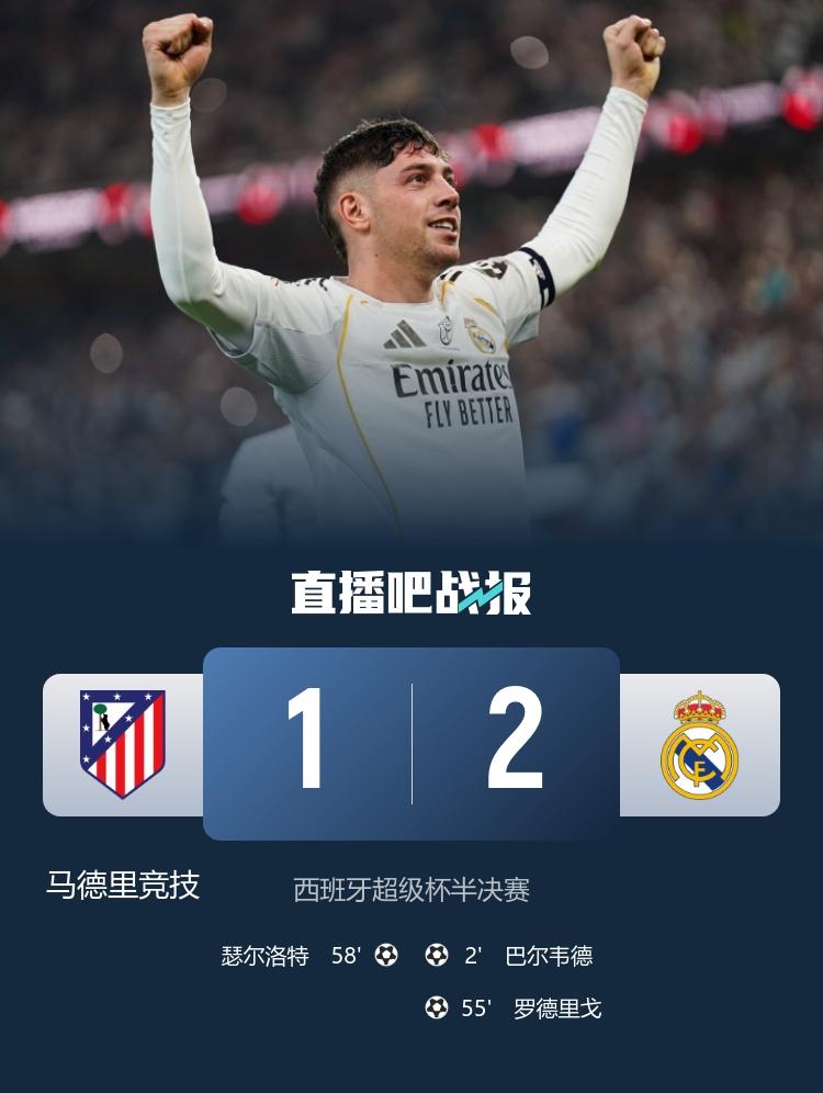 西班牙超级杯半决赛,马德里竞技1-2皇家马德里,巴尔韦德世界波+传射。