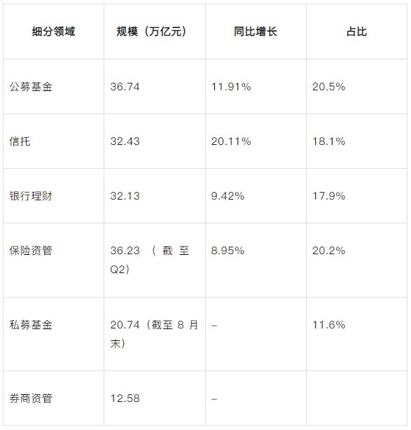 中国财富管理行业在2025年呈现出规模持续扩张、结构优化升级的发展特征。根据中信金控财富委资产管理工作室发布的数据,截至2025年三季度末,中国资产管理行业总规模达到179.33万亿元,其中各细分领域呈现差异化增长态势:
