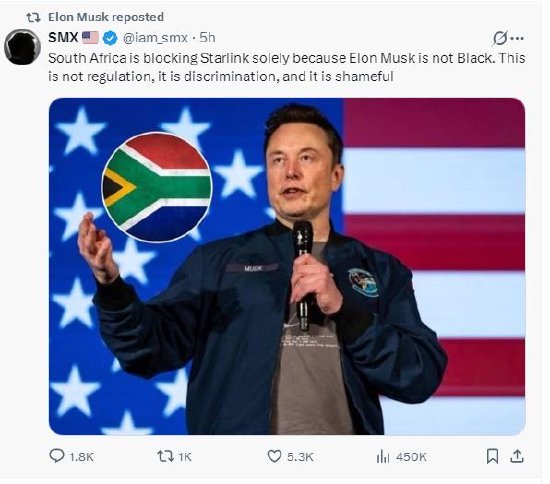 马斯克在一条帖子中表示:“星链之所以无法在南非获得互联网服务提供商牌照,唯一的原因是我不是黑人。这可不行。”