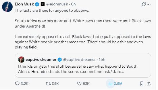 较早时马斯克在另一条帖子中表示:“事实摆在那里,任何人都可以观察。南非现在的反白人法律比种族隔离时期的反黑人法律还多!我极端反对针对黑人的法律,但同样反对针对白人或其他种族的法律。应该有一个公平、公正的竞争环境。”