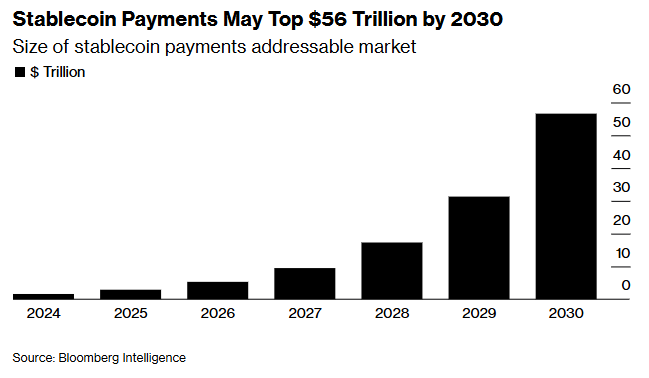 即便如此,稳定币的增长仍在加速。根据Artemis的数据,2025年第四季度的稳定币交易量达到创纪录的11万亿美元,而第三季度为8.8万亿美元。根据分析,到2030年,稳定币支付总规模可能触及56万亿美元。
