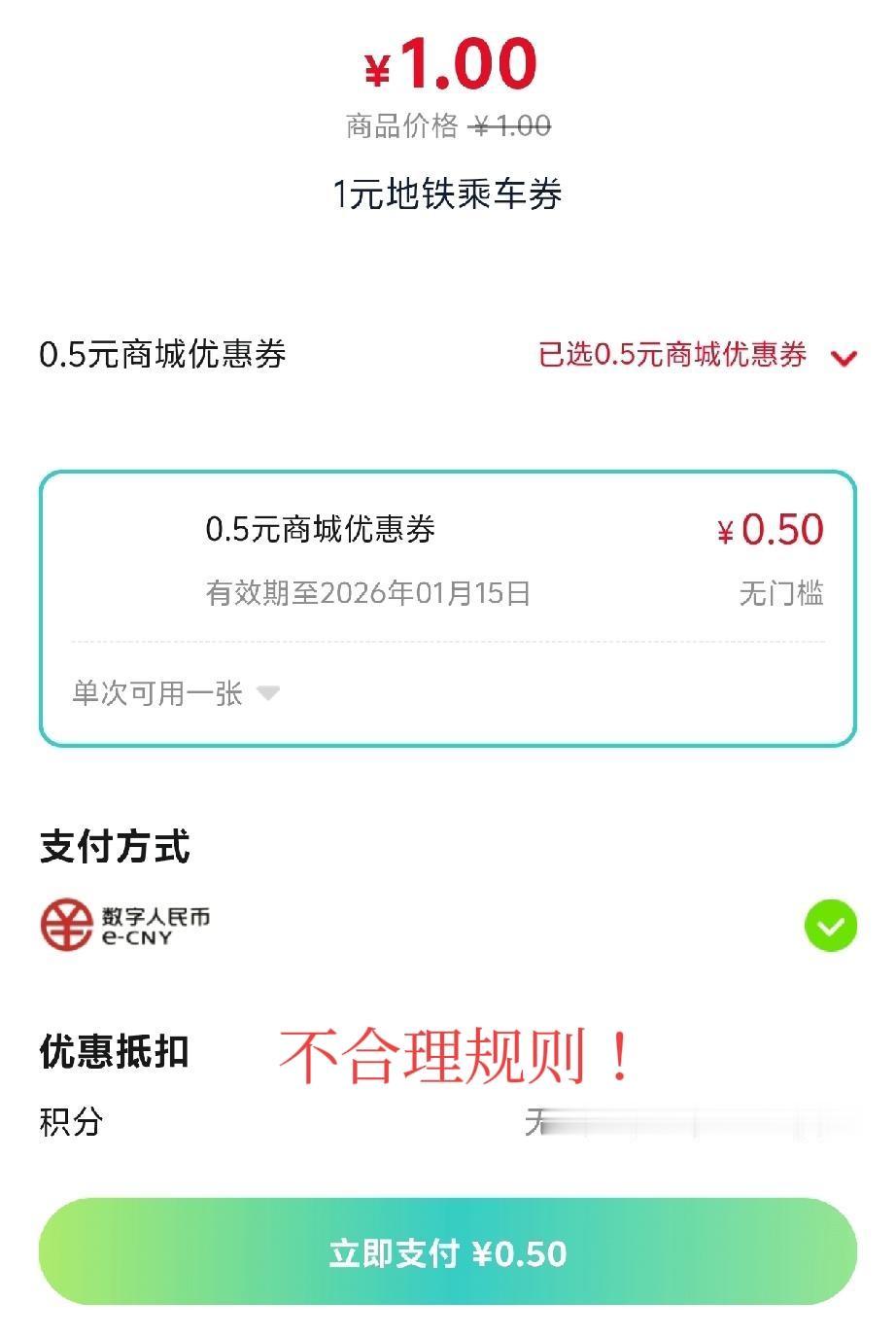 现在青岛青碳行app每天上午十点发放的0.5元商城抵扣券也不用抢了!因为现在规则改了,领了这个券,买公交地铁乘车券时也不能和积分或者碳减排量共用,比如说你用这个0.5元券买1元乘车券,那你就得开通数字人民币然后支付0.5元。 用青岛地铁app乘车,一小时内乘坐两次两元公交支付1.4元,加上买乘车券支付的数字人民币0.5元,实际支付1.9元。不用乘车券的话,一小时内乘坐两次两元公交支付2.4元,你抢了0.5元商城抵扣券也就能省0.5元,真没什么意思,所以领取的人少了很多!青岛青碳行app越来越坑,越来越抠搜,每天下午发个福利乘车券还是九折,你还不一定能抢到,干脆取消得了!