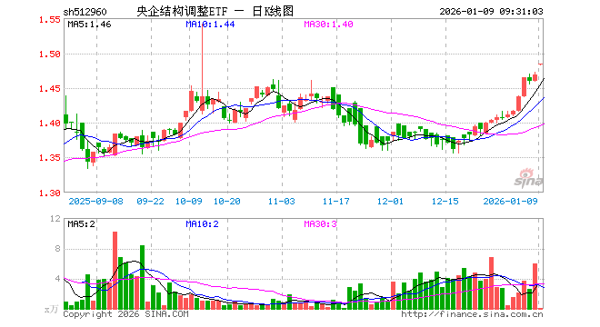 1月9日,央企结构调整ETF(512960)开盘涨0.95%,报1.483元。央企结构调整ETF(512960)重仓股方面,澜起科技开盘跌0.82%,中芯国际跌0.77%,海康威视跌0.10%,国电南瑞跌0.08%,招商银行跌0.10%,宝钢股份涨0.00%,中国神华跌0.12%,长安汽车跌0.25%,中国电信跌0.16%,中国建筑涨0.19%。