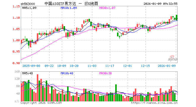 1月9日,中国A50ETF易方达(563000)开盘涨1.74%,报1.110元。中国A50ETF易方达(563000)重仓股方面,宁德时代开盘跌0.01%,紫金矿业跌0.83%,工业富联跌1.35%,贵州茅台涨0.33%,海光信息跌1.52%,寒武纪跌1.66%,比亚迪涨0.18%,恒瑞医药跌0.03%,立讯精密跌0.56%,中际旭创跌3.28%。