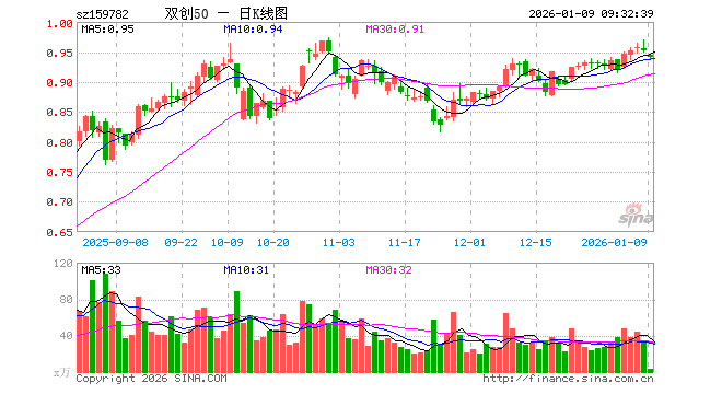 1月9日,双创50ETF(159782)开盘跌0.74%,报0.945元。双创50ETF(159782)重仓股方面,宁德时代开盘跌0.01%,新易盛跌3.25%,中际旭创跌3.28%,中芯国际跌0.77%,寒武纪跌1.66%,阳光电源跌0.92%,海光信息跌1.52%,澜起科技跌0.82%,胜宏科技跌1.59%,汇川技术跌0.15%。