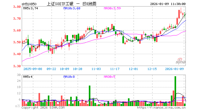 1月9日,截止午间收盘,上证50ETF工银(510850)跌0.37%,报3.724元,成交额781.83万元。上证50ETF工银(510850)重仓股方面,贵州茅台截止午盘涨0.43%,中国平安跌1.99%,招商银行跌0.82%,紫金矿业涨2.51%,长江电力跌0.26%,兴业银行跌0.57%,恒瑞医药跌0.69%,中信证券跌0.53%,寒武纪跌0.37%,药明康德涨1.46%。