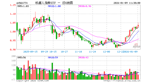 1月9日,截止午间收盘,机器人指数ETF(560770)涨0.88%,报1.036元,成交额3826.03万元。机器人指数ETF(560770)重仓股方面,汇川技术截止午盘涨0.23%,科大讯飞涨0.71%,石头科技涨0.24%,大华股份涨0.47%,中控技术涨0.64%,大族激光涨6.26%,机器人涨0.65%,双环传动涨1.14%,科沃斯涨0.17%,云天励飞涨0.74%。