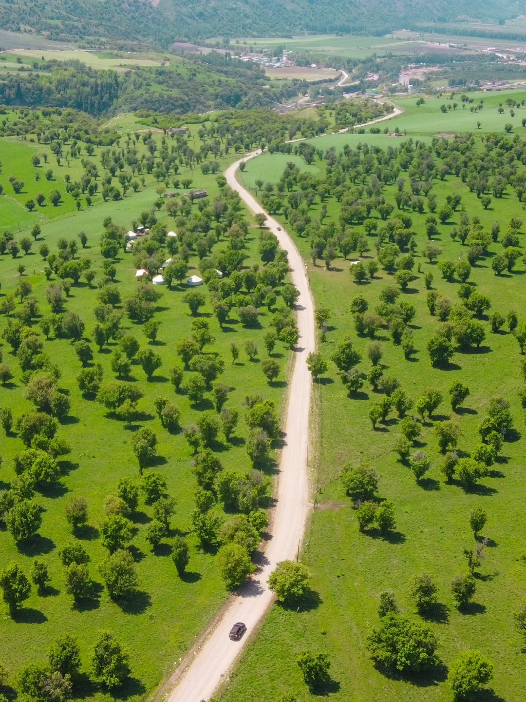 2⃣️达到导航位置后,继续往前开几百米,路两边就是苹果林(航拍图可见)这里比较平坦,航拍出片。也有一些农家乐,夏天旺季会开门营业,游客可以休息喝东西。