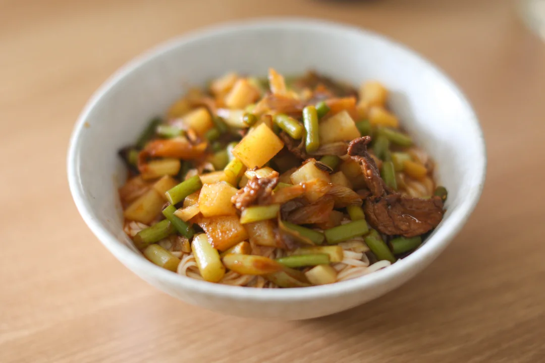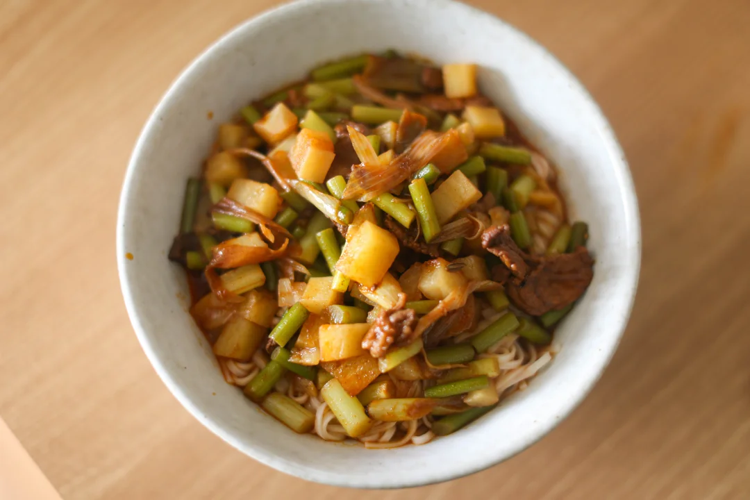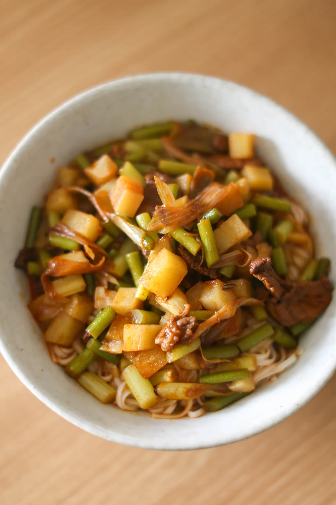 捞面条,这是河南话。两锅做面条是安阳本地人的叫法。 夏季的各种时令蔬菜炒一下,放点汤。面条单独煮熟,浇上臊子,饱腹感很强的一碗碳水,幸福!
