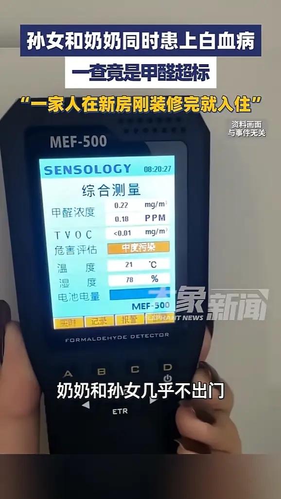 “悲剧还是发生了!”河南南阳,一男子在新房刚装修好时,就带着全家搬进去住,因为平时工作忙,所以大多数时间都是母亲和女儿在家,结果女儿身体不适去医院检查,竟发现得了白血病,治疗期间,母亲也确诊了白血病!医生:甲醛超标害的! 这是个真实发生在河南南阳的家庭悲剧,一名3岁女孩被确诊患上急性髓系白血病,在治疗过程中,她56岁的奶奶也确诊了白血病。 短时间内两位家人接连患上白血病,医生警觉地询问生活环境,才发现问题出在新装修的房子上。这家人装修完就入住了,父亲因工作经常不在家,而奶奶和孙女两人大部分时间都待在室内。 经专业机构检测,这个即使已装修近三年的房子,室内甲醛含量依然超标。正是这看不见摸不着的甲醛,成了夺走健康的隐形杀手。 医学研究表明,室内甲醛污染是儿童白血病高发的主要原因之一。有数据显示,不少儿童白血病患者家中半年内都曾进行过装修。甲醛被世界卫生组织列为一类致癌物,其危害不容小觑。 新房装修后,很多人急于入住,却忽略了甲醛释放周期长的特性。日本横滨大学研究指出,甲醛、苯等有害气体释放期可达3到15年。即使装修七年的房子,仍有甲醛超标的案例。 对于有孕妇、儿童和老人的家庭,建议装修后通风至少半年到一年再入住。最简单有效的方法是坚持开窗通风,加速有害物质扩散。 选择环保材料、简化装修也能从源头减少污染。入住前最好请专业机构进行空气质量检测,确保安全后再入住。 装修新房本是喜事,但健康安全必须放在第一位。切莫因一时心急,让新家变成健康的隐形杀手。 各位读者你们怎么看?欢迎在评论区讨论。