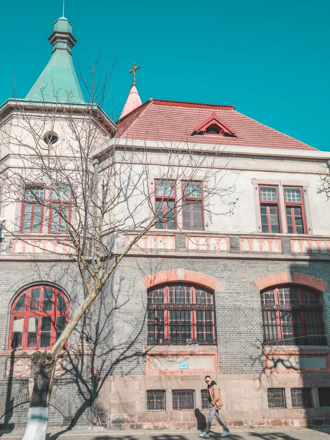 (我住的是漫心青岛栈桥火车站酒店)感觉还可以,他们家楼顶可以拍到教堂