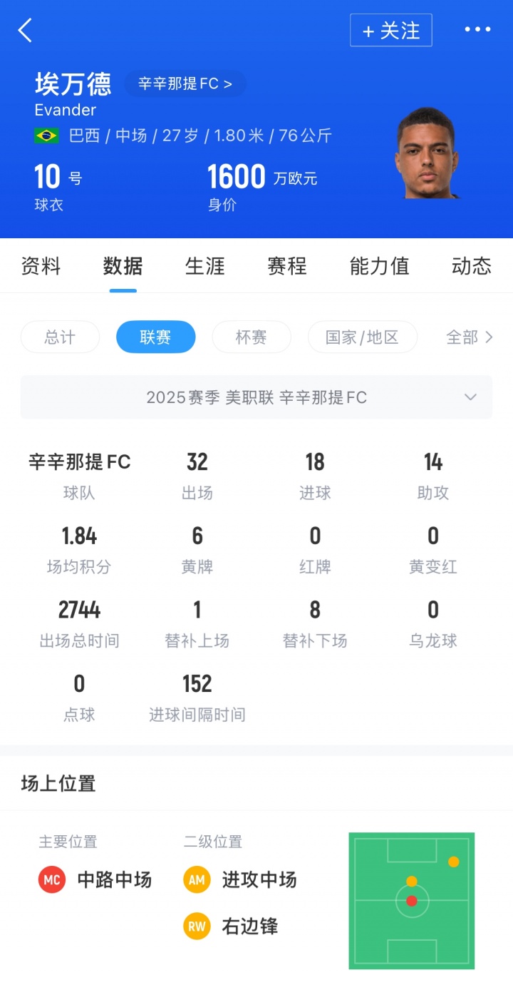 上赛季,埃万德在美职联出场32次,攻入18球并有14次助攻。