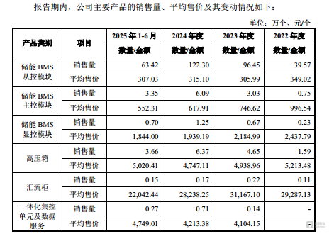更为直观的竞争力下滑信号,来自核心产品平均销售单价的持续走低。从业务上看,高特电子主要拥有储能BMS相关产品,一体化集控单元及数据服务,后备电源、动力电池BMS等产品及服务,具体情况如下: