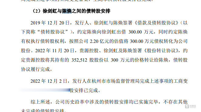 笔者注意到,在公司发展历程中,一位名为陈焕的神秘股东通过债转股方式实现巨额收益,其入股成本与同期市场价格的巨大价差,以及身份信息的未披露,引发了市场热议。2019年12月,高特电子、徐剑虹与陈焕签署《借款及债转股协议》,约定陈焕向徐剑虹出借300万元,同时约定陈焕有权执行债转股权利,按照公司2.20亿元的估值将300.00万元债权转化为公司股份。2022年11月20日,贵源控股、徐剑虹及陈焕签署《股份转让协议》,约定贵源控股将其持有的35.25万股股份以300万元的价格转让给陈焕,折合每股8.15元。