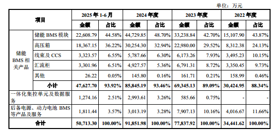 而储能BMS相关产品又包含储能BMS模块、高压箱、线束及CCS、汇流柜、其他,其中储能BMS模块产生的销售收入分别为15107.9万元、33238.84万元、44729.85万元、22608.79万元,分别占当期主营业务收入的43.87%、42.7%、48.7%、44.58%,为高特电子最重要的产品。