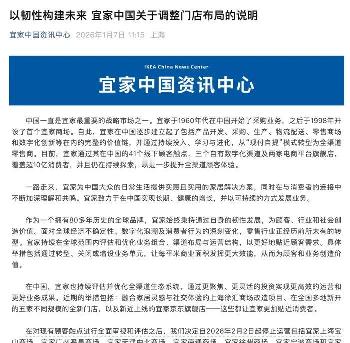 宜家关停七店,家居大卖场粗放增长时代宣告终结! 曾凭借“商业地产+零售”领跑行业的模式,如今成了卖场前进的沉重枷锁。红星美凯龙的核心物业,正被折旧、贬值压力持续挤压利润空间。 居然智家深耕轻资产赛道,依托数字化平台“洞窝”降低实体依赖,这让它在行业寒冬中保留了核心的造血能力。 除资产端的困境,大卖场运营效率也被电商贴身紧逼。“高客流、低转化”的乱象,暴露出身处消费场景错配的尴尬处境。 宜家转向“精准深耕”修正门店模式,红星美凯龙引入新能源业态补场,全行业正告别囤地收租的粗放玩法。 中国家居零售已迈入存量棋局,无论外资还是本土玩家,唯有向精细化运营与全渠道要增量,方能在行业裂变中站稳脚跟。