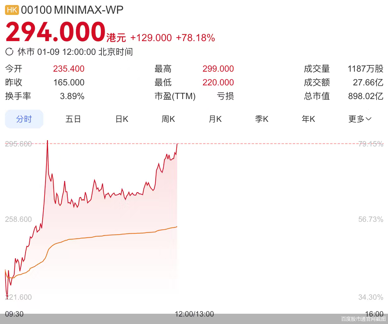 1月9日上午,MiniMax在港交所主板正式挂牌交易,开盘报235.4港元,和116.5港元的发行价相比上涨42.7%。早盘股价一度飙至295.6港元,按上午收盘时的股价294港元计算,总市值898.02亿港元。