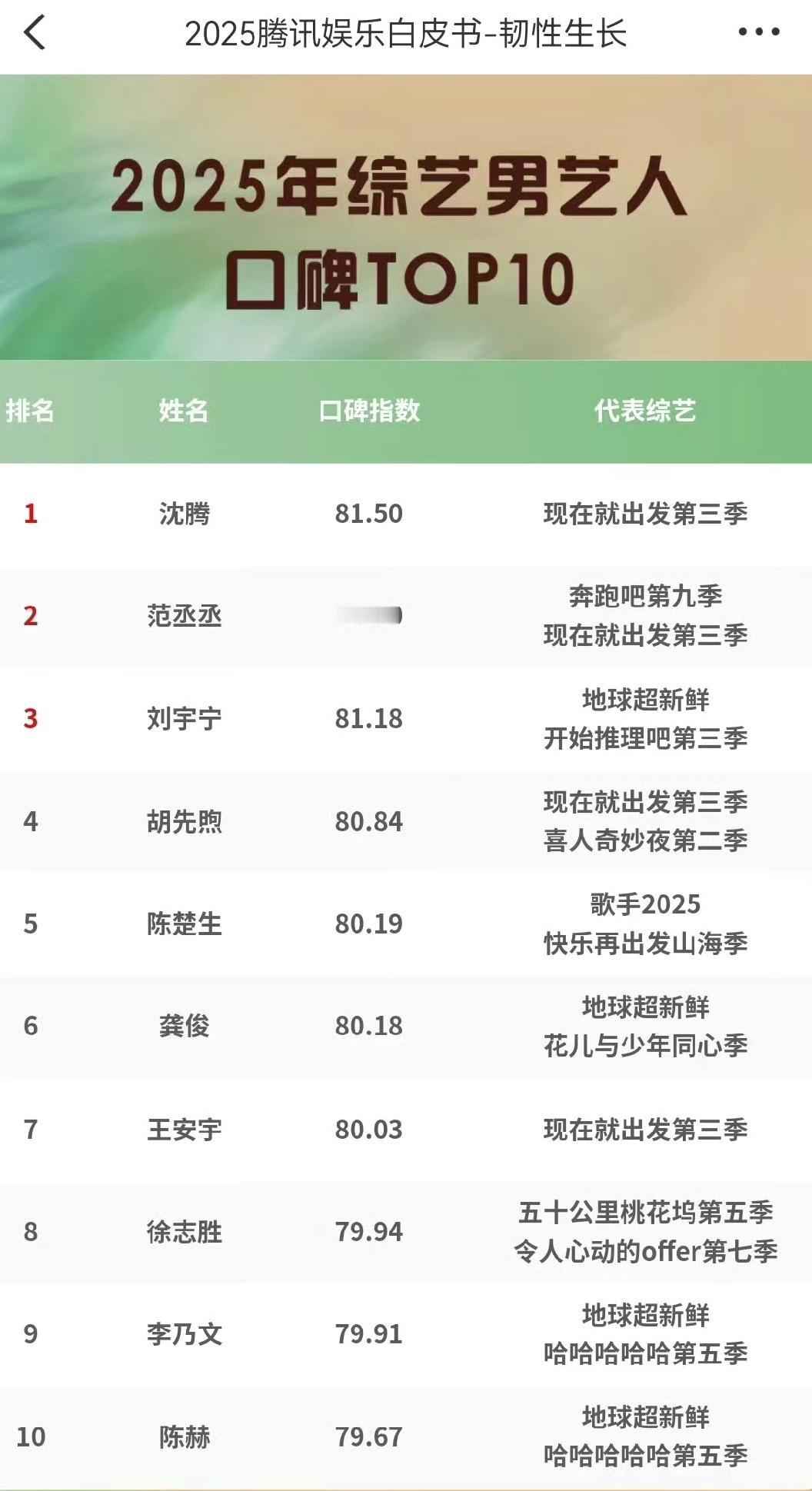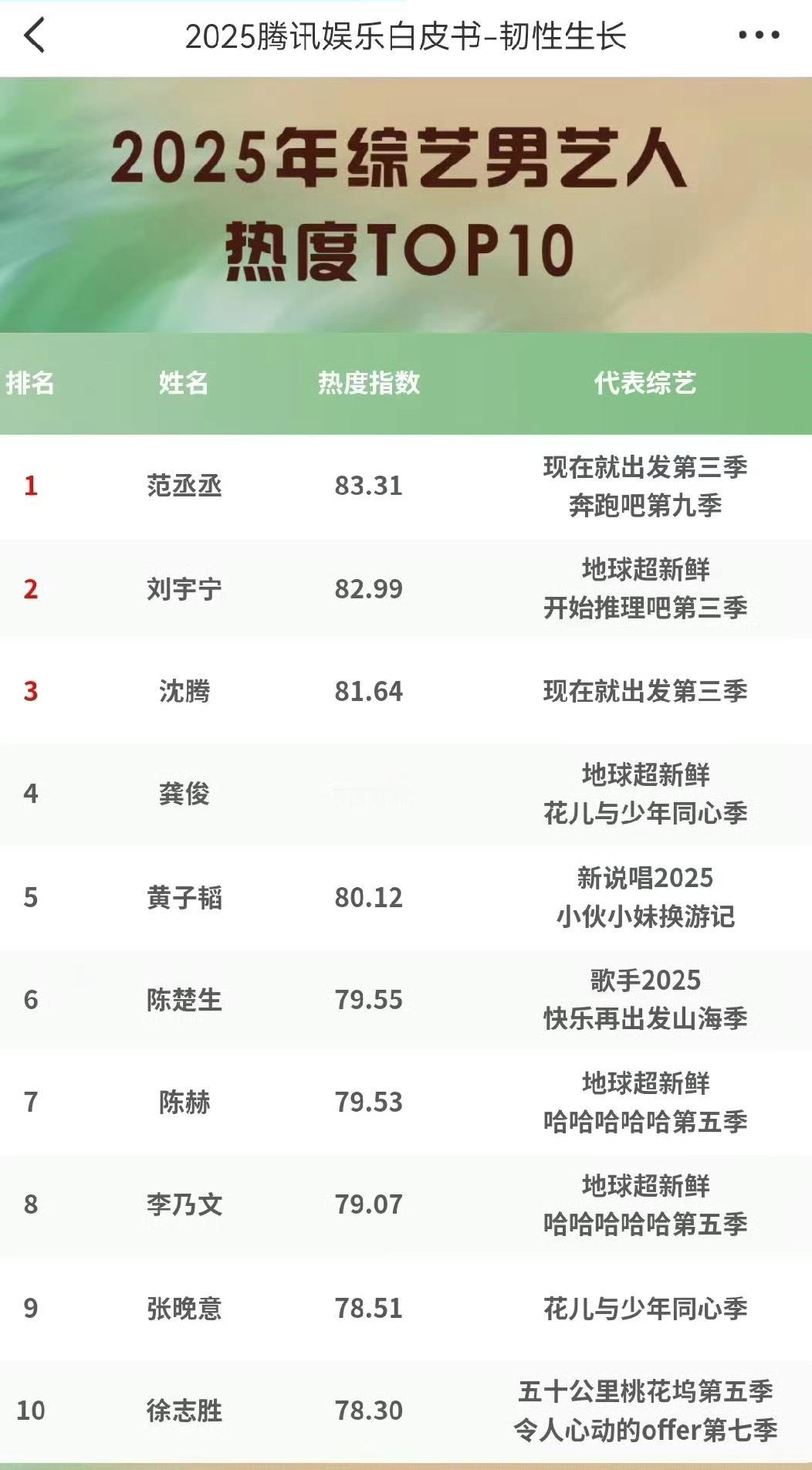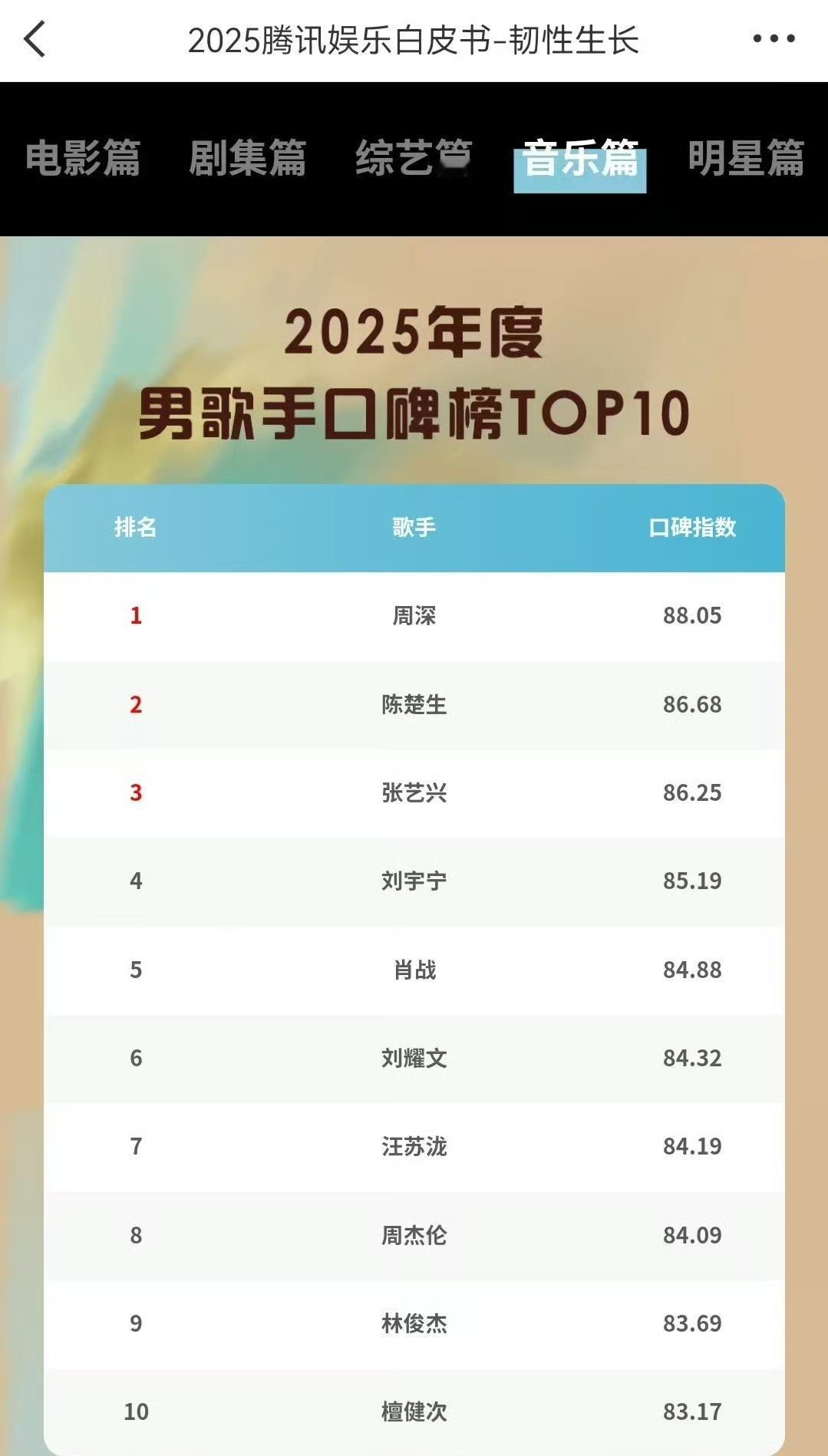 腾讯娱乐白皮书,陈楚生战绩不错哦。 首先是巅峰潮流榜十大艺人! 其次《庙堂之外》获巅峰潮流榜单曲 2025年度男歌手口碑榜TOP2,仅在周深之下, 2025年度综艺男艺人热度TOP6, 综艺男艺人口碑TOP5, 代表综艺是《快乐再出发》和《歌手》,果真是提也没提《快乐老友记》啊! 2025音乐节压轴频次TOP8! 虽然每年腾讯娱乐白皮书总有一些让人不能理解的地方,长长的榜单看的让人眼花缭乱,但是能看到陈楚生的大名出现这么多次,还是感到很欣慰,观众的眼睛是雪亮的,他的光芒是压不住的,在这个年纪重返大众视线并且能迅速登顶,还有谁? 所以说还是服气吧,冠军就是冠军,大哥永远也是大哥!陈楚生