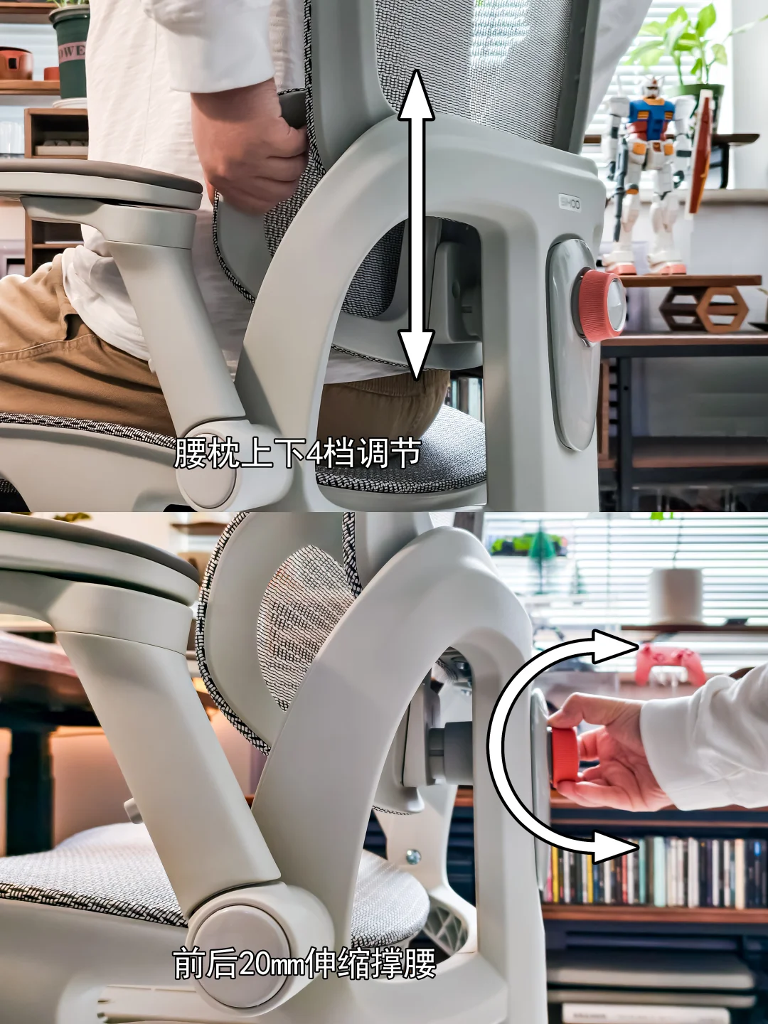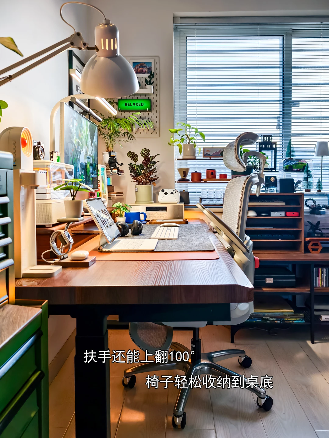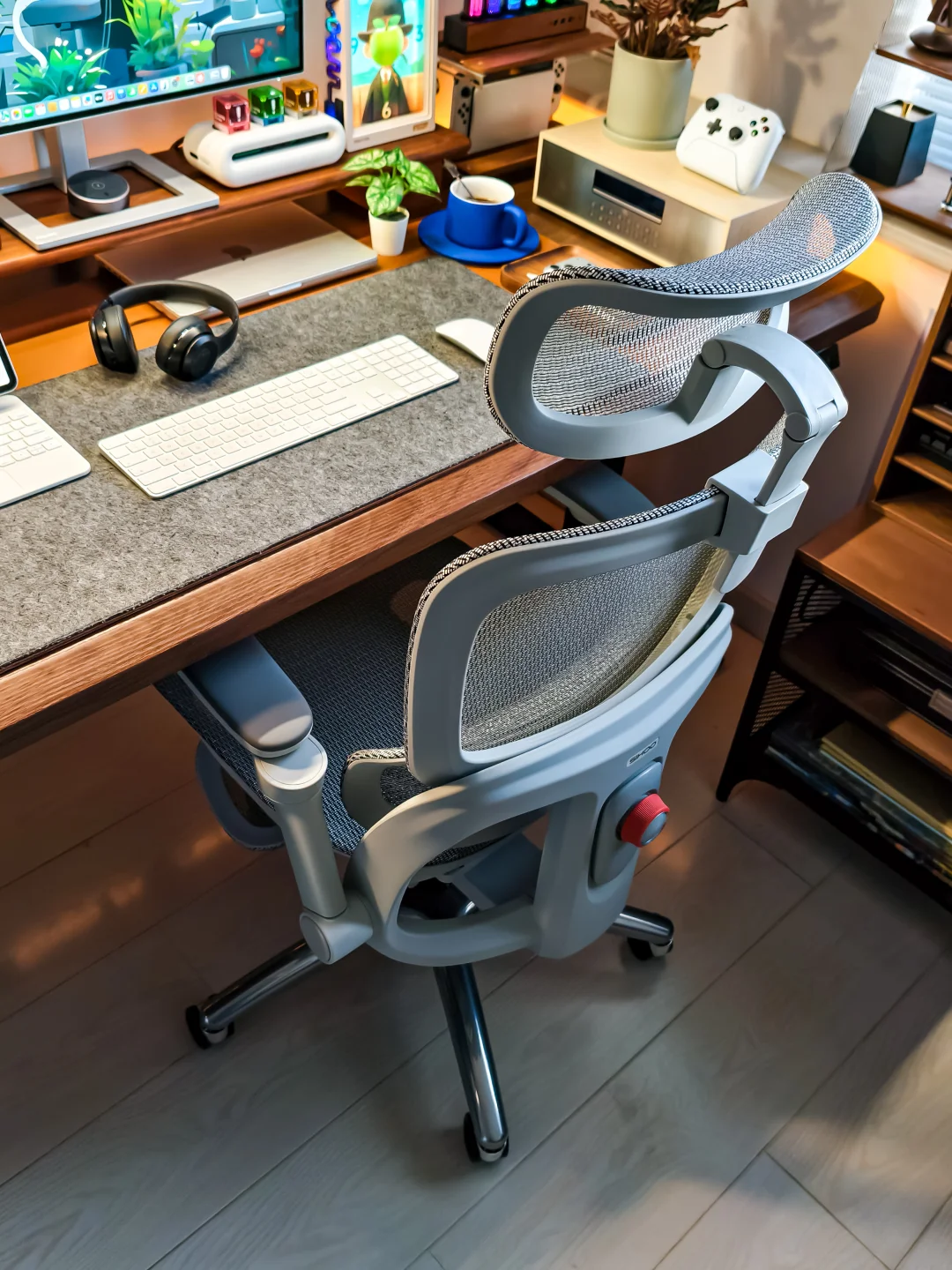不知从什么时候开始,我的书房成了我一天待得最久的地方,虽然房间不大,可我还是尽量让我的书房更加舒适,毕竟办公、阅读、打游戏刷剧,常常一待就是一整天。作为一名桌搭爱好者,之前总纠结桌面摆件的颜值,直到久坐腰酸到直不起身才发现:一把舒服的椅子,才是桌搭幸福感的核心!毕竟再精致的桌搭,要是坐的不舒服,也会大大折扣! ~ 西昊B300人体工学椅真的精准戳中了我的需求,椅背上那个醒目的红色旋钮,操作起来完全不费力——轻轻拧动就能实现精准的前后调节,平时前倾办公或者游戏的时候,让它前移紧紧贴合腰部曲线,腰部能一直得到稳稳的支撑;这个红色旋钮真的是点睛之笔,让每一种坐姿都能兼顾舒适和支撑!这才是真护腰啊! ~ 腰靠还能上下四档调节,轻轻拨动档位,本人181cm的身高都能精准适配~ 不用费劲儿就能找到贴合自身身形的位置,久坐也能稳稳承托,毫无压力感! ~ 更绝的是前后浮弹追腰和左右3度动态撑腰设计!不管是办公时换坐姿、打游戏时动来动去,腰枕都能自适应贴合腰部曲线,护腰安全感直接拉满~ ~ 6D联动扶手也是惊喜款!上下、前后、内外调节+360度翻转就算了,100度翻折功能真的拯救小户型!不用的时候推进桌子底下,瞬间腾出大片活动空间,椅子推进去完全不占地儿,太实用了。 ~ 坐感方面,密楞波浪特网布的透气性绝了,网孔大、弹力足,夏天久坐也不会闷出汗,亲肤不粘腿,坐上去软乎乎又有支撑,完全不会有塌陷感。而且它能147°后仰,还带脚托!午休时拉出来秒变躺椅,打游戏累了靠一会儿,追剧时瘫着放松,关键后仰时扶手还会联动支撑,手臂不用悬空,摸鱼休息都超舒服。 ~ 最让我满意的是它的颜值适配性!B300设计低调不突兀,不管是复古木质风、极简工业风还是实用学生党桌面,都能无缝融入,完全不破坏桌搭整体美感。 ~ 我的小书房既是高效办公的专属空间,忙完后往这儿一待,又秒变治愈小窝~ 西昊B300太懂小户型的痛了,不占多余空间,却能稳稳撑起舒适感。加班赶工后靠在上面,听首喜欢的歌、眯上十几分钟,软乎乎的包裹感太治愈,舒服到让人忘了疲惫~