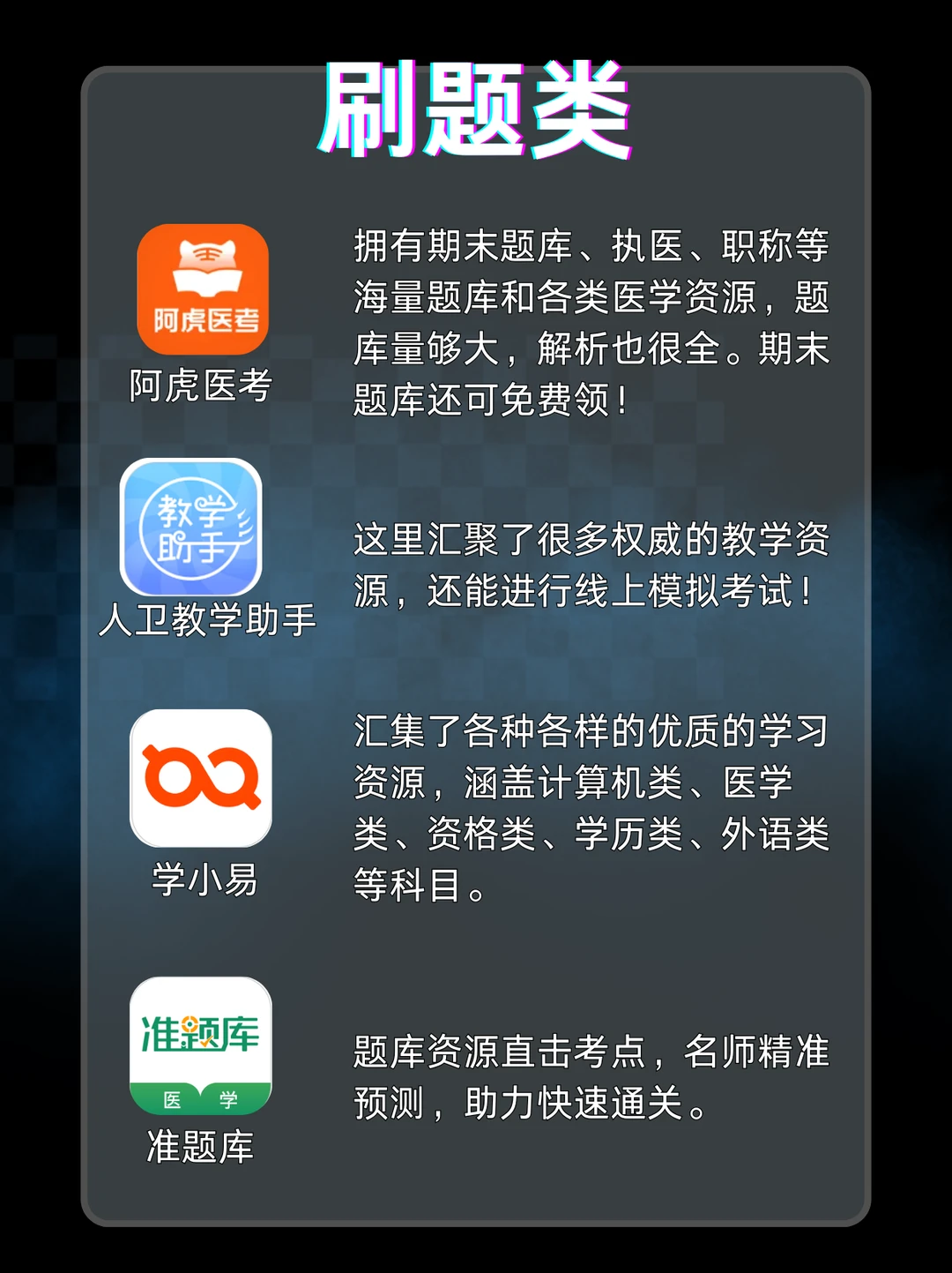 [蓝色心形R]阿虎医考:拥有海量题库和各类医学资源,包含期末、执医、职称各类别的考试题库。
