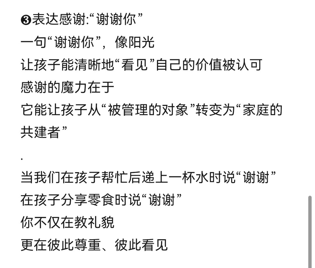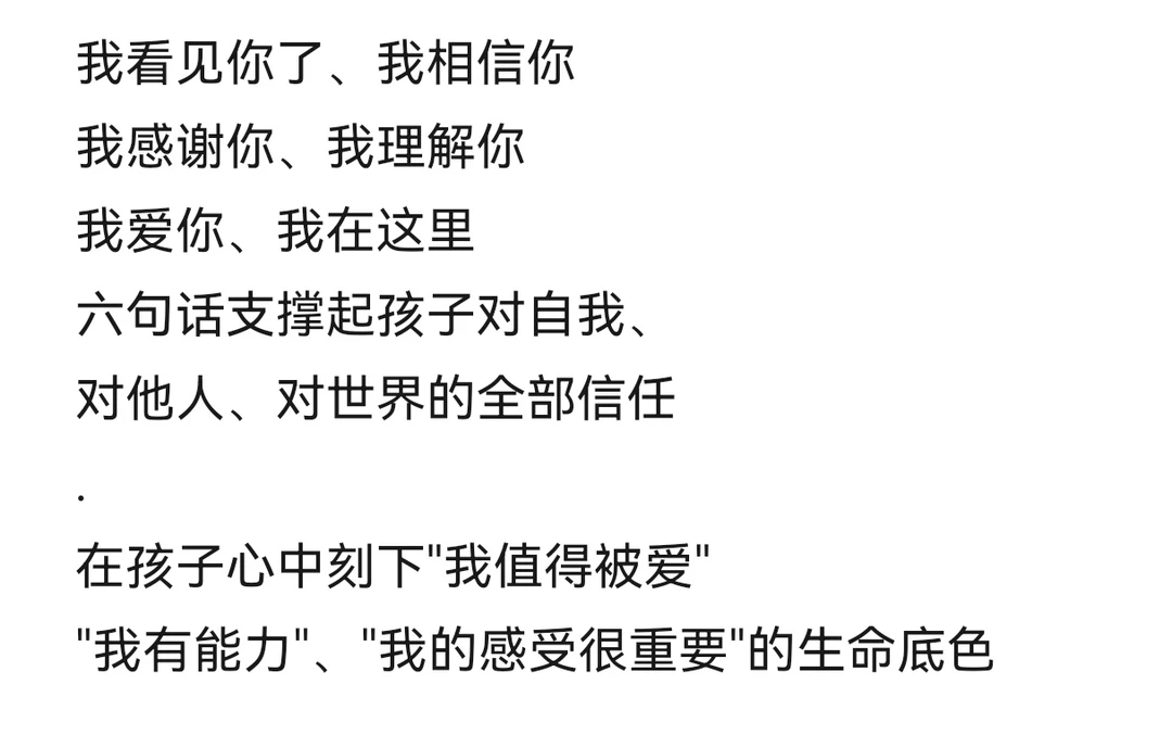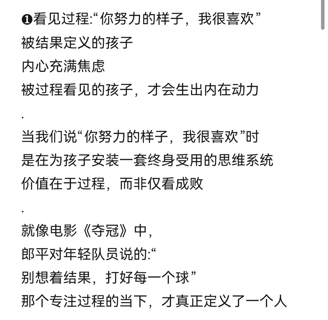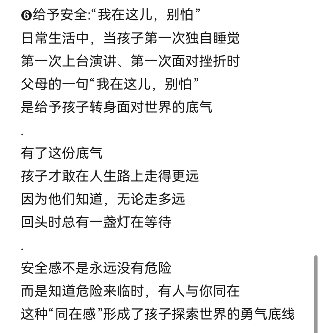 春风化雨般的言语 是滋养孩子心灵蕞好的养分 我们这一代人 大多在“不打不成器”的训诫中长大 . 养育孩子后才渐渐懂得: 教育的本质不是雕刻,而是唤醒 吼叫只会让孩子的心灵紧闭 而温和坚定的引导 却能唤醒孩子内在的光芒 . 养育孩子要会"哄",他才会越来越优秀 你一定记得常说这6句话 ❶看见过程:"你努力的样子,我很喜欢" 被结果定义的孩子 内心充满焦虑 被过程看见的孩子,才会生出内在动力 . 当我们说"你努力的样子,我很喜欢"时 是在为孩子安装一套终身受用的思维系统 价值在于过程,而非仅看成败 . 就像电影《夺冠》中, 郎平对年轻队员说的:“ 别想着结果,打好每一个球” 那个专注过程的当下,才真正定义了一个人 . ❷建立信任:“我相信你能做好” 《论语.子张》:“信而后谏,未信则以为谤己也” 先有信任的土壤 教育的种子才能生根发芽 . 信任不是无心的你真棒 而是沉甸甸的托付 它传递的信息是:我看到了你尚未展现的能力 . 当你对孩子说“我相信你能做好”时 你不仅是在鼓励一次尝试 更是在塑造一个面对人生风雨时 始终相信自己的灵魂 . ❸表达感谢:"谢谢你" 一句"谢谢你",像阳光 让孩子能清晰地"看见"自己的价值被认可 感谢的魔力在于 它能让孩子从“被管理的对象”转变为“家庭的共建者” . 当我们在孩子帮忙后递上一杯水时说"谢谢" 在孩子分享零食时说"谢谢" 你不仅在教礼貌 更在彼此尊重、彼此看见 . ❹接纳情绪:"我理解你的感受" 当孩子哭闹时 告诉孩子,"妈妈知道你很想玩那个玩具 现在不能玩,你心里特别难受对不对? 而不是“不许哭!再哭就不要你了" 情绪如河流,宜疏不宜堵 孩子的情绪才能在安全的河道中流淌 而不是任其决堤泛滥 . ❺无条件爱:"我爱你,不管怎样都爱你" 无条件爱的核心不是溺爱 而是剥离所有外在条件后 坚定地确认:"你的存在本身,就值得被爱"l" . ❻给予安全:"我在这儿,别怕" 日常生活中,当孩子第一次独自睡觉 第一次上台演讲、第一次面对挫折时… 详细查看图片 . 好的教育,始于言语,终于心灵 蕞好的滋养就藏在日常蕞朴素的言语里 . 我看见你了、我相信你 我感谢你、我理解你 我爱你、我在这里 六句话支撑起孩子对自我 对他人、对世界的全部信任 . 在孩子心中刻下"我值得被爱" "我有能力"、"我的感受很重要"的生命底色 . 陶行知说: 教育是心心相印的活动,唯独从心里发出来 才能打动心灵的深处 教育的奇迹 往往就发生在你把命令换成理解 把苛责换为欣赏的瞬间,一起共勉