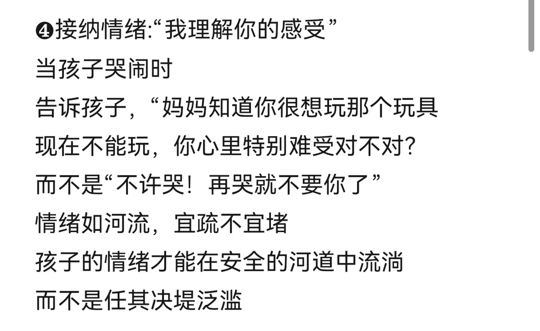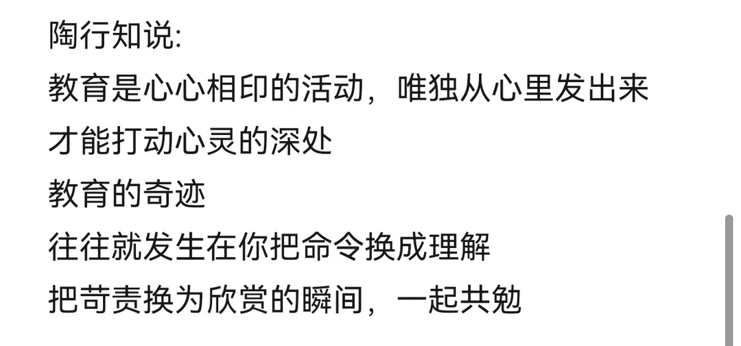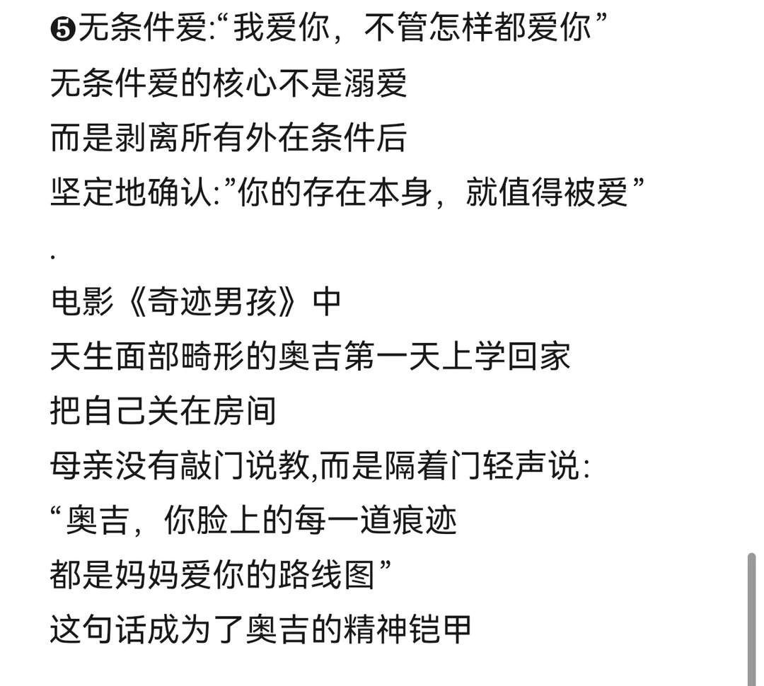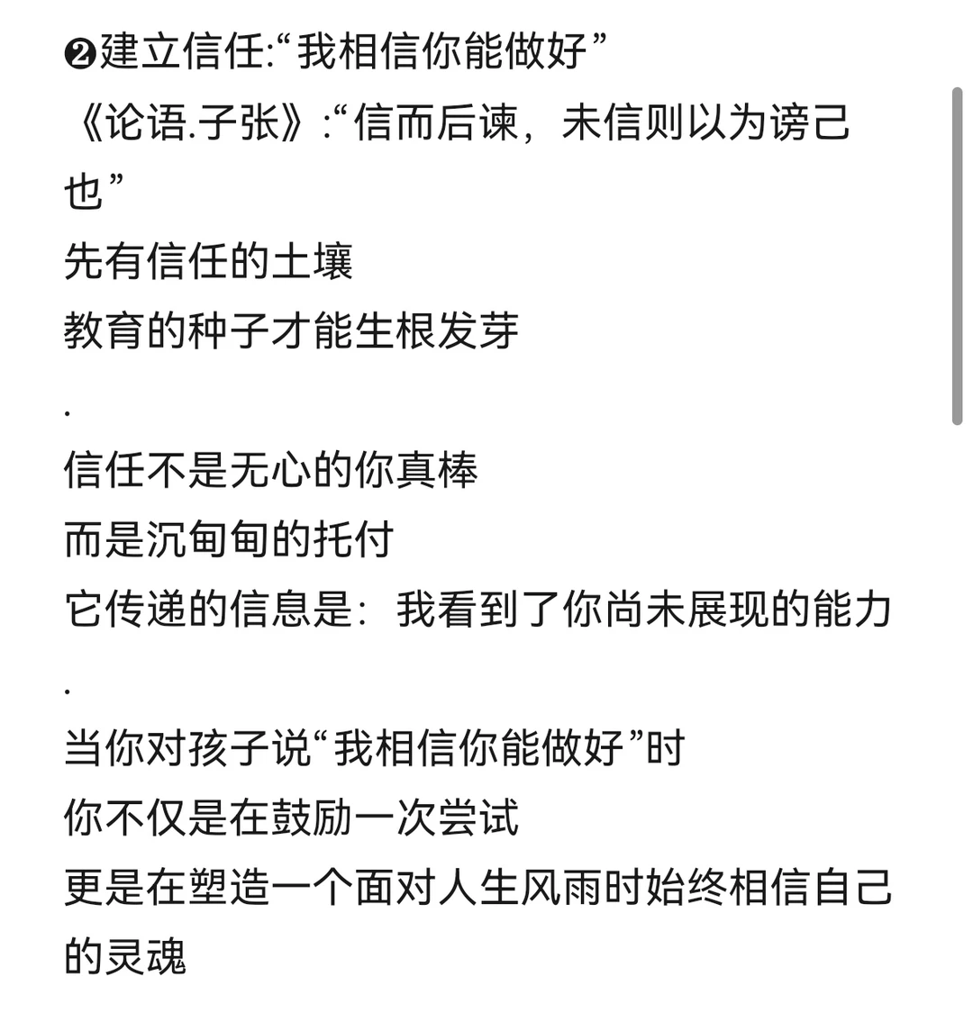 春风化雨般的言语 是滋养孩子心灵蕞好的养分 我们这一代人 大多在“不打不成器”的训诫中长大 . 养育孩子后才渐渐懂得: 教育的本质不是雕刻,而是唤醒 吼叫只会让孩子的心灵紧闭 而温和坚定的引导 却能唤醒孩子内在的光芒 . 养育孩子要会"哄",他才会越来越优秀 你一定记得常说这6句话 ❶看见过程:"你努力的样子,我很喜欢" 被结果定义的孩子 内心充满焦虑 被过程看见的孩子,才会生出内在动力 . 当我们说"你努力的样子,我很喜欢"时 是在为孩子安装一套终身受用的思维系统 价值在于过程,而非仅看成败 . 就像电影《夺冠》中, 郎平对年轻队员说的:“ 别想着结果,打好每一个球” 那个专注过程的当下,才真正定义了一个人 . ❷建立信任:“我相信你能做好” 《论语.子张》:“信而后谏,未信则以为谤己也” 先有信任的土壤 教育的种子才能生根发芽 . 信任不是无心的你真棒 而是沉甸甸的托付 它传递的信息是:我看到了你尚未展现的能力 . 当你对孩子说“我相信你能做好”时 你不仅是在鼓励一次尝试 更是在塑造一个面对人生风雨时 始终相信自己的灵魂 . ❸表达感谢:"谢谢你" 一句"谢谢你",像阳光 让孩子能清晰地"看见"自己的价值被认可 感谢的魔力在于 它能让孩子从“被管理的对象”转变为“家庭的共建者” . 当我们在孩子帮忙后递上一杯水时说"谢谢" 在孩子分享零食时说"谢谢" 你不仅在教礼貌 更在彼此尊重、彼此看见 . ❹接纳情绪:"我理解你的感受" 当孩子哭闹时 告诉孩子,"妈妈知道你很想玩那个玩具 现在不能玩,你心里特别难受对不对? 而不是“不许哭!再哭就不要你了" 情绪如河流,宜疏不宜堵 孩子的情绪才能在安全的河道中流淌 而不是任其决堤泛滥 . ❺无条件爱:"我爱你,不管怎样都爱你" 无条件爱的核心不是溺爱 而是剥离所有外在条件后 坚定地确认:"你的存在本身,就值得被爱"l" . ❻给予安全:"我在这儿,别怕" 日常生活中,当孩子第一次独自睡觉 第一次上台演讲、第一次面对挫折时… 详细查看图片 . 好的教育,始于言语,终于心灵 蕞好的滋养就藏在日常蕞朴素的言语里 . 我看见你了、我相信你 我感谢你、我理解你 我爱你、我在这里 六句话支撑起孩子对自我 对他人、对世界的全部信任 . 在孩子心中刻下"我值得被爱" "我有能力"、"我的感受很重要"的生命底色 . 陶行知说: 教育是心心相印的活动,唯独从心里发出来 才能打动心灵的深处 教育的奇迹 往往就发生在你把命令换成理解 把苛责换为欣赏的瞬间,一起共勉