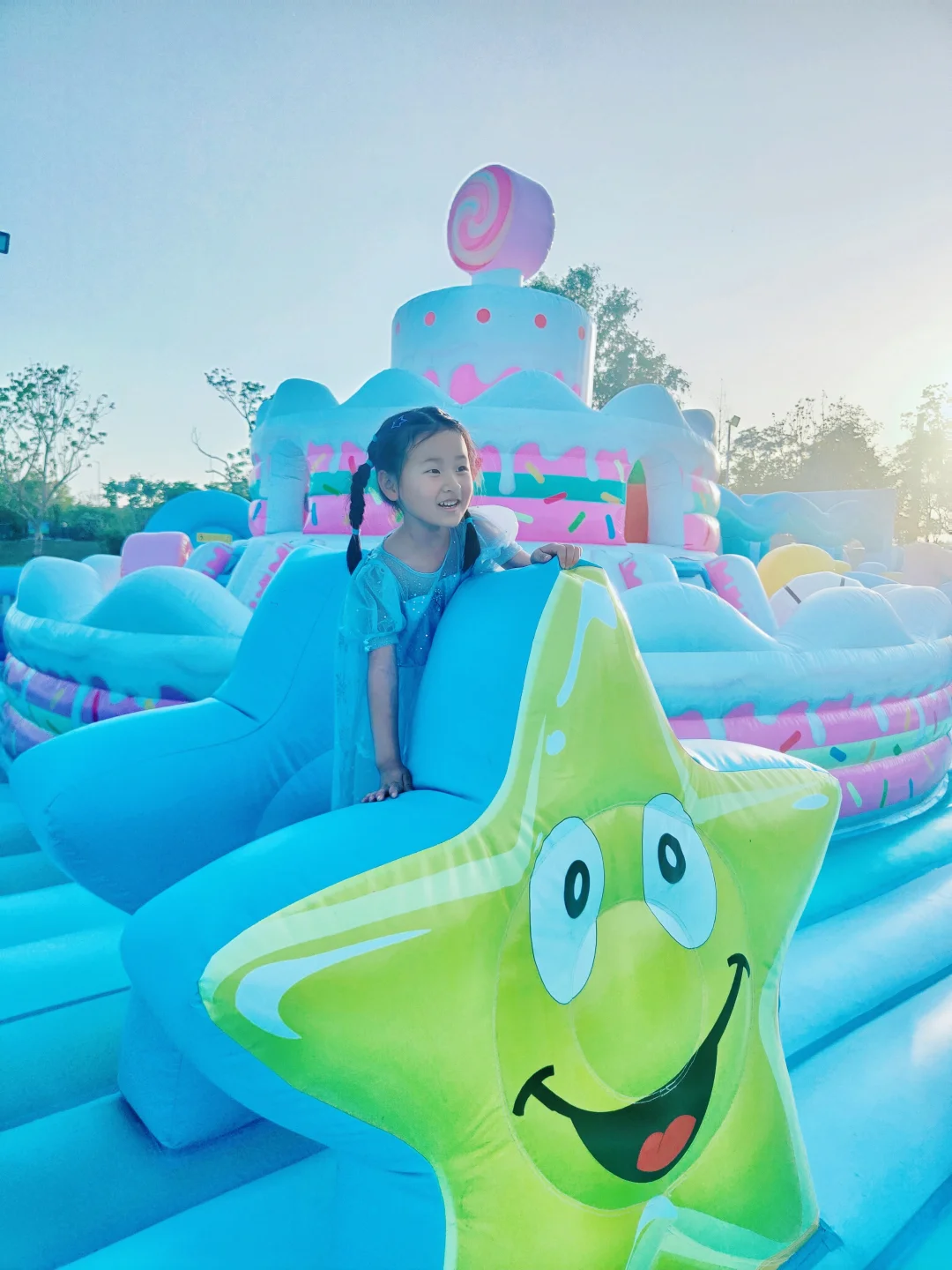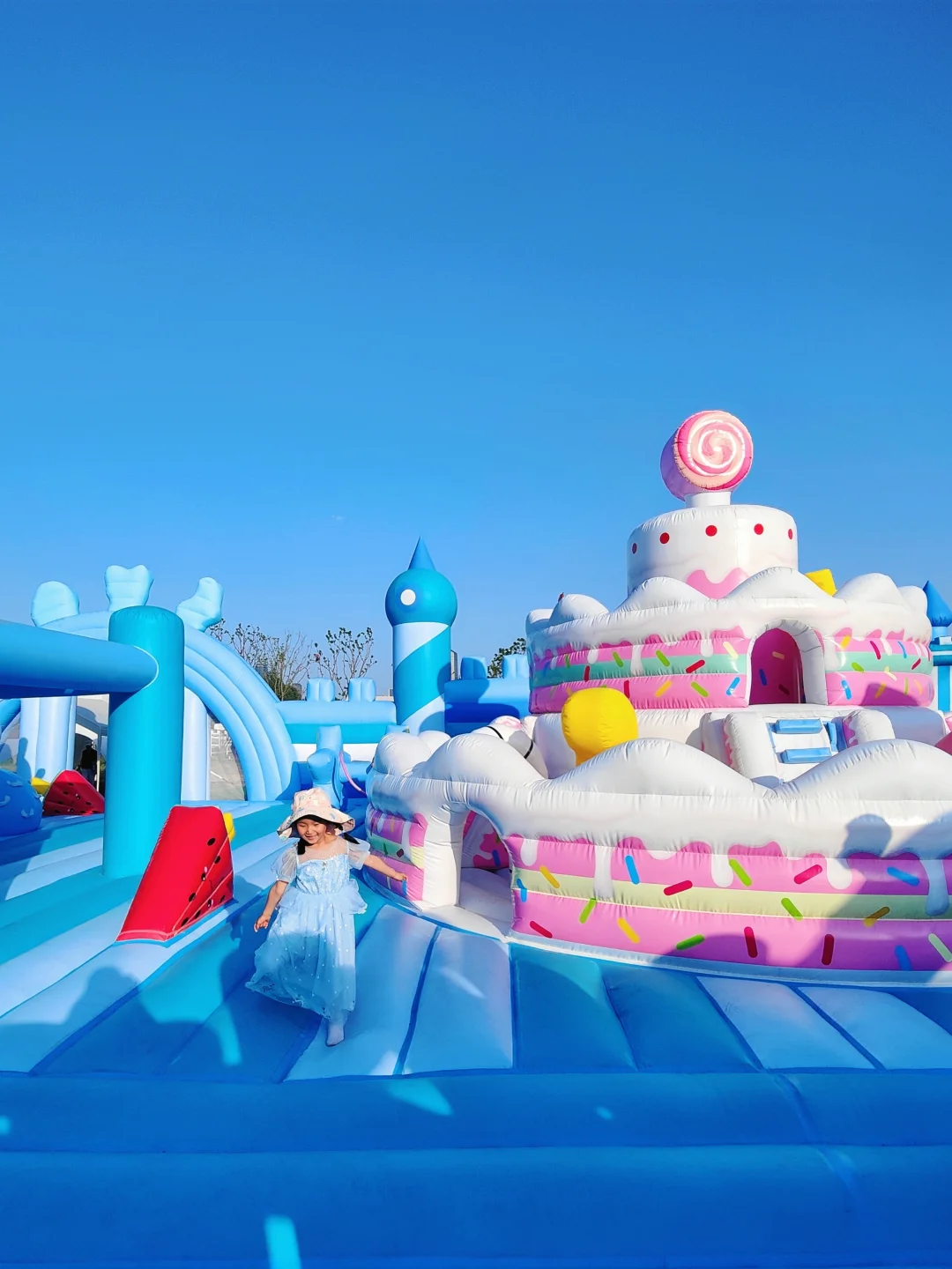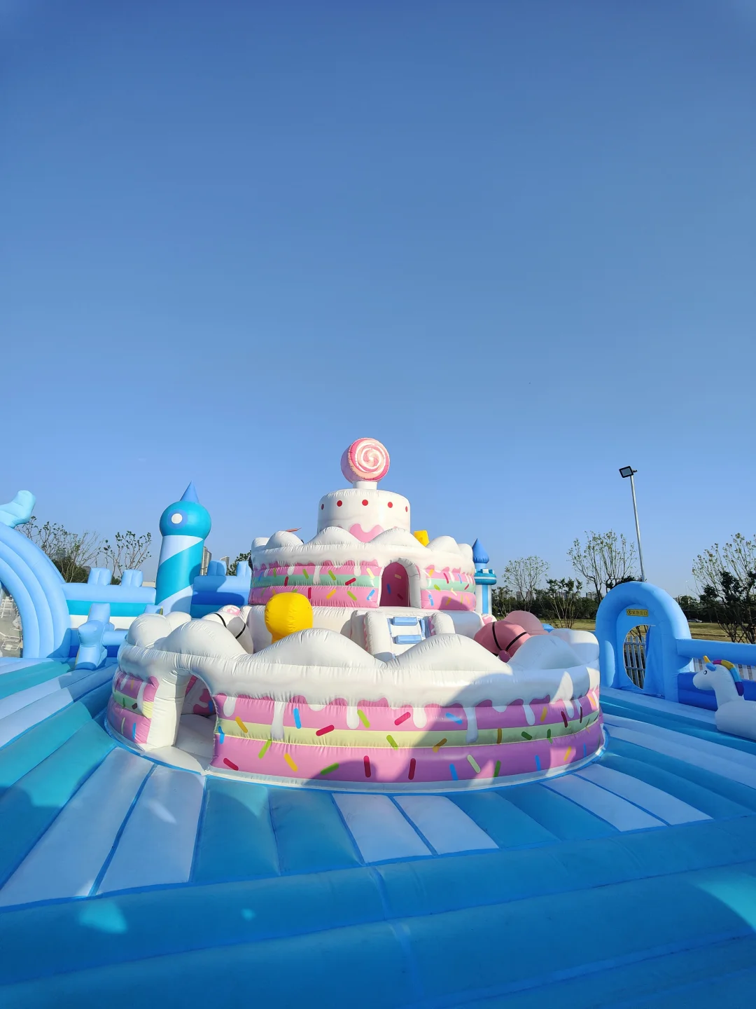 浅蓝色为主色调,双层蛋糕塔——闯关区——舞台区——滑梯区——动物区——休息区