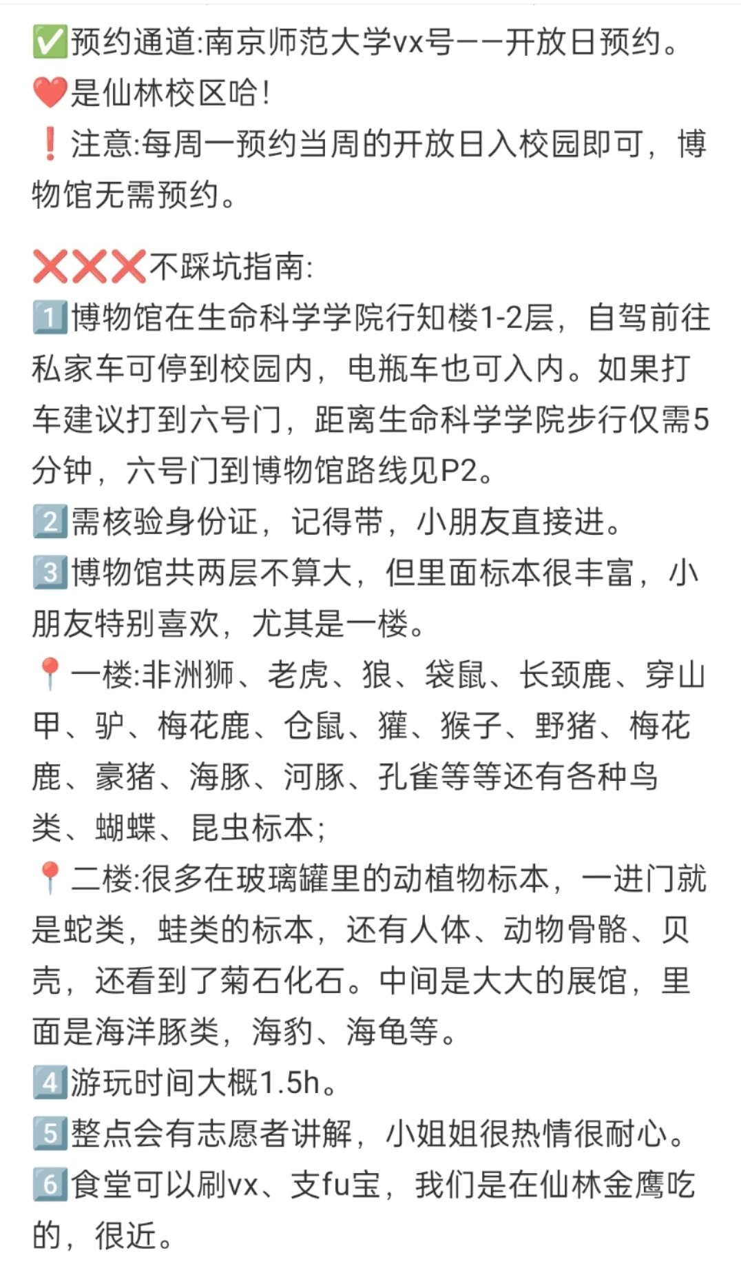 ❤️终于等到你,南京师范大学珍稀动植物博物馆! 🔥2025年免费开放月来啦! 📍南京市栖霞区文苑路1号 南京师范大学生命科学学院行知楼1-2楼 🚘进校方式:南京师范大学vx号预约(仙林校区)预约成功后凭本人身份证从文苑路1号正门入校。 ⏰活动对象:社会公众 ⭐️活动时间:2025年3月 每周六、周日 即:3月8-9日、15-16日、22-23日、29-30日 10:00-16:00 ✅路线详见P2 ✅攻略详见P18