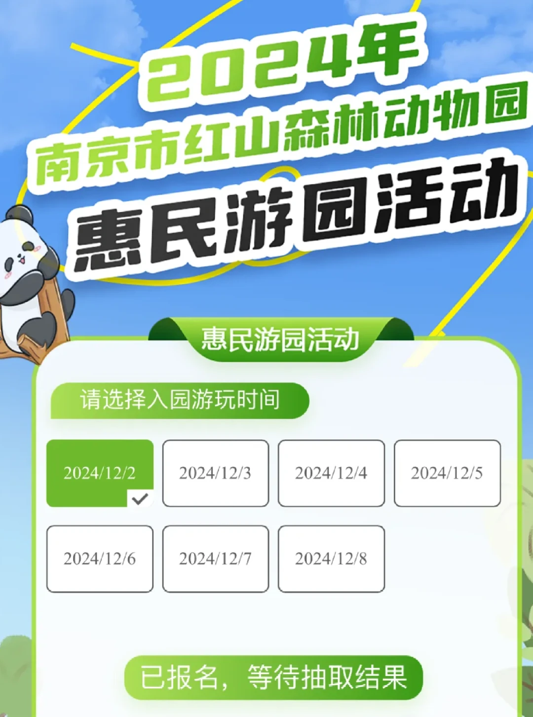 ✅免费开放日: 2024年12月2日 - 12月8日(每天限量5000个名额) ✅报名时间:2024年11月22日 9:00 - 11月24日 17:00 ✅报名方式:南京市红山森林动物园vx号报名参与,抽奖公证本次惠民游园活动名额,由南京市公证处于2024年11月26日 - 11月27日进行抽取。 ✅抽中信息发布南京市红山森林动物园vx号将于2024年11月28日进行结果公示,并以短信形式通知所有抽中者。 🔥快快