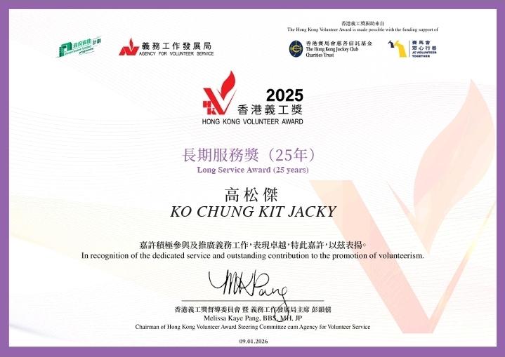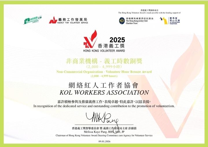 香港义工奖颁逾4.6万奖项创新高 由民政及青年事务局与义务工作发展局合办,香港赛马会慈善信託基金透过「赛马会众心行善」计划支持的年度义工嘉许—「香港义工奖颁奖礼暨论坛 2025」于2026年1月9至10日一连两日举行,颁发逾 46,000 个奖项创新高,以表扬表现卓越的个人义工、青年义工/团队、企业、非商业机构、屋苑及学校等,肯定他们对社会的贡献。 活动邀请到香港特别行政区行政长官夫人、荣誉贊助人及义工总领袖李林丽婵、民政及青年事务局副局长梁宏正、香港赛马会董事胡家骠及义务工作发展局主席彭韵僖担任主礼嘉宾。另外,一众杰出义工系列奖项评审委员、督导委员会及小组委员,贊助及支持机构代表亦一同出席向得奖者致以祝贺。 「香港义工奖 2025」共颁发逾 46,000个奖项,较去年增加逾 40%,充分反映社会各界对义务工作的广泛参与和支持。今年更设立「十大杰出义工」名衔,从各杰出类别中甄选具卓越贡献的义工,向他们的无私奉献致以崇高敬意,更增设「青年制服团体义工奖(义工时数)」奖项,旨在鼓励青年透过参与制服团体展现行义精神,为有需要人士送上关怀。 香港网络红人工作者协会今年有幸获得非商业机构奖 (义工时数)铜奖,我们一班青年KOL积极参与社会服务,线上为社会发放正能量线下为社会传递关爱,全力协助特区政府及社区,用爱心及网络扶助弱势社区,发放工量,在过去派出义工队担任十五运会义工及义务宣传,发放全运会正能量、派出义务友师参与共创明teen、动员担任义工支援大埔宏福苑大火、为社区培训Kol知识(青少年、少数族裔、老友记),以及各地区服务等。 另外,恭贺本会多名义工也分别获得金、银、铜及优异奖等个人奖(义工时数),高Sir作为协会主席,实在非常感谢每一位成员的努力,「因为平凡,所以坚持 因为坚持不懈,所以杰出卓越」,高Sir作为第八届香港杰出义工奖得奖者(2019年)也很荣幸出席见证,我鼓励更多市民,特别是年轻人投入义务工作,推动创用凝聚力量,多用自媒赋能地区治理及义工行动、共建「关爱香港 人人行义」的关爱社会,再次感谢大会举办活动,以及各位义工的无私付出。 「香港义工奖 2025」以「创新领航.行义新时代」为主题,旨在鼓励义工,特别是青年人,将创意及科技融入义务工作,拓展服务范畴,提升义工服务的影响力与社会价值。 香港义工奖香港青年活动