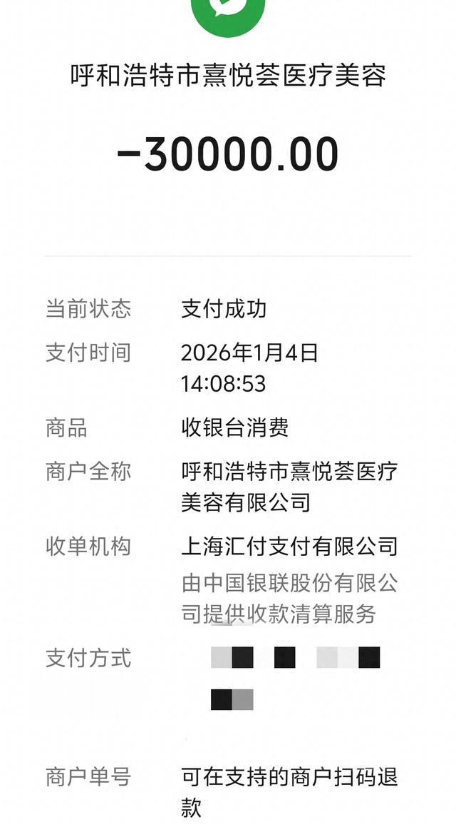 1月7日,内蒙古晨报晨网·速闻新闻24小时新闻专线0471-3339111接到呼和浩特市民陈静的反映,称其在回民区熹悦荟医疗美容门诊部消费3万元购买医美套餐,完成1次提拉紧致项目后,因认为效果不佳且质疑注射针剂缺乏品牌说明,提出退款诉求,但未能与商家达成一致。