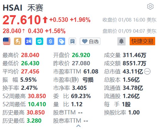 格隆汇1月9日|昨日收涨1.96%的禾赛(HSAI.US)今日美股盘前续涨1.56%,报28.04美元。消息面上,中金发报告指,禾赛本月在CES2026上展示最新激光雷达技术成果,并更新交付量、产能规划、战略合作等经营情况。量产交付能力领先行业;国内外产能稳步推进。L3车型获工信部准入许可,激光雷达单车数量有望提升。Robotaxi、机器人等下一代物理AI浪潮袭来,激光雷达成关键引擎。该行维持对禾赛2025年营收预测不变,上调2026年营收预测6.4%。考虑到智驾及机器人板块估值中枢上移,上调美股目标价至31.56美元。(格隆汇)