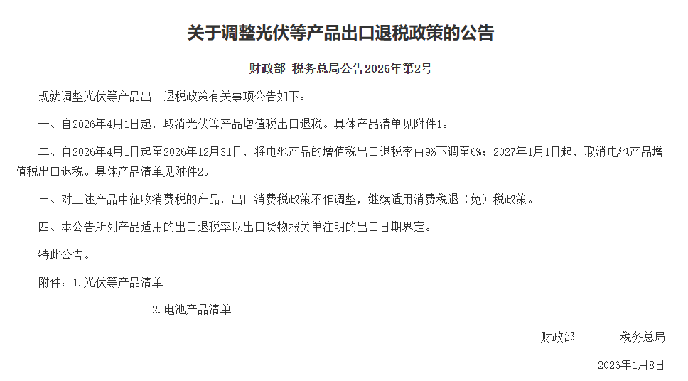 根据公告,自2026年4月1日起,取消光伏等产品增值税出口退税。自2026年4月1日起至2026年12月31日,将电池产品的增值税出口退税率由9%下调至6%;2027年1月1日起,取消电池产品增值税出口退税。