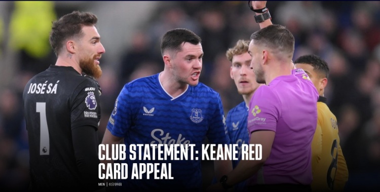 直播吧1月9日讯埃弗顿足球俱乐部遗憾地宣布,关于迈克尔·基恩在周三对阵狼队的英超比赛中被罚下场的上诉已被英足总小组驳回。