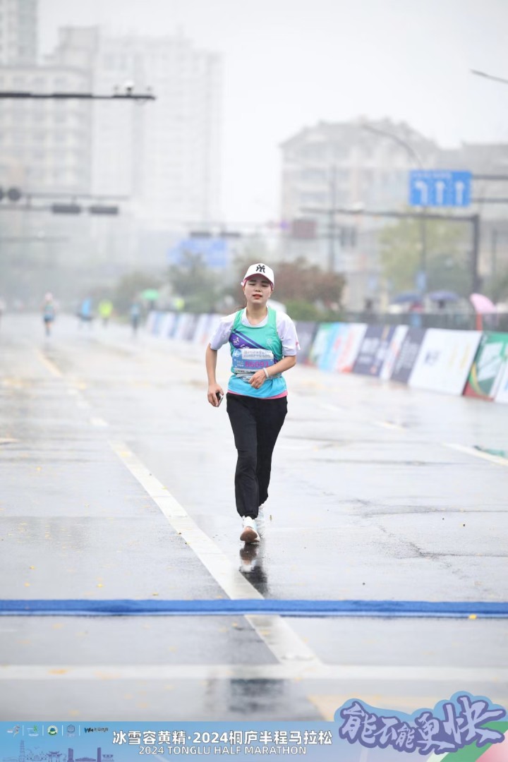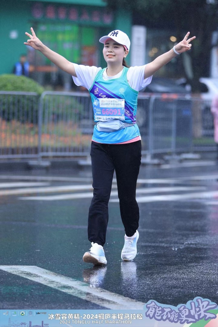 后来慢慢开始跑步,因为体重上来了,断断续续跑了两年,都是没规律地跑。2024年10月,她鼓起勇气挑战了桐庐半程马拉松,并在3小时关门时间前两分钟,惊险冲过终点。“跑完浑身酸痛,瘫了一个星期,但那种成就感,是以前从未有过的”。