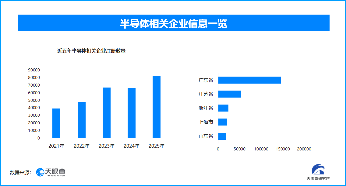天眼查专业版数据显示,截至目前我国现存在业、存续状态的半导体相关企业超41.1万家。其中,2025年新增注册相关企业超8.2万余家,从企业注册数量趋势来看,近五年间,半导体相关企业的注册数量呈现出逐年增长的态势,并在2025年达到顶峰。