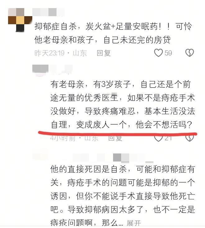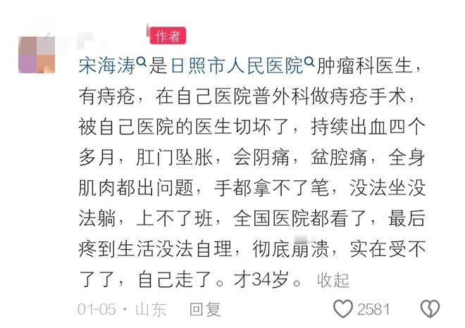近日,山东日照某医院肿瘤科34岁医生宋某某离世一事引发社会广泛关注。据了解,宋某某为该院业务骨干,平素无重大疾病史,其突然离世的原因引发多方猜测。 家属表示,宋某某的离世与该院多年前为其实施的痔疮手术存在关联,但未透露具体细节。对此,涉事医院工作人员予以否认,称该手术系五年前进行,时隔已久,不应与此次离世存在直接联系。 另有知情人士透露,宋某某术后曾出现持续四个多月的出血症状,病情进展后甚至无法正常坐卧。期间,其辗转多家医疗机构就诊,症状始终未得到有效缓解,最终因不堪忍受病痛选择轻生。 公开信息显示,宋某某家中尚有年迈母亲及三岁幼童需要抚养,且仍有未还清的房贷。外界普遍认为,若非病痛达到难以承受的程度,其不会做出极端选择。 目前,当地卫生健康委员会已介入此事,相关调查工作正在进行中。