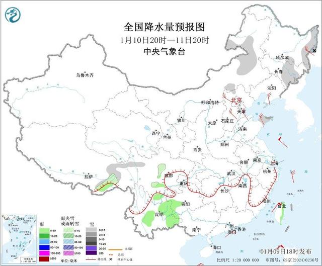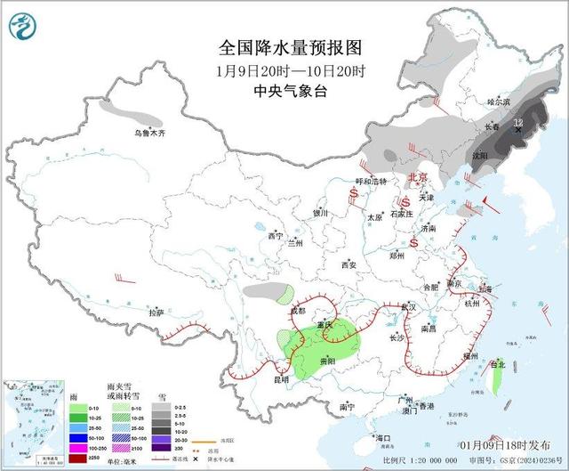 图3全国降水量预报图(1月9日20时-10日20时)
