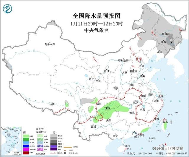 图5全国降水量预报图(1月11日20时-12日20时)