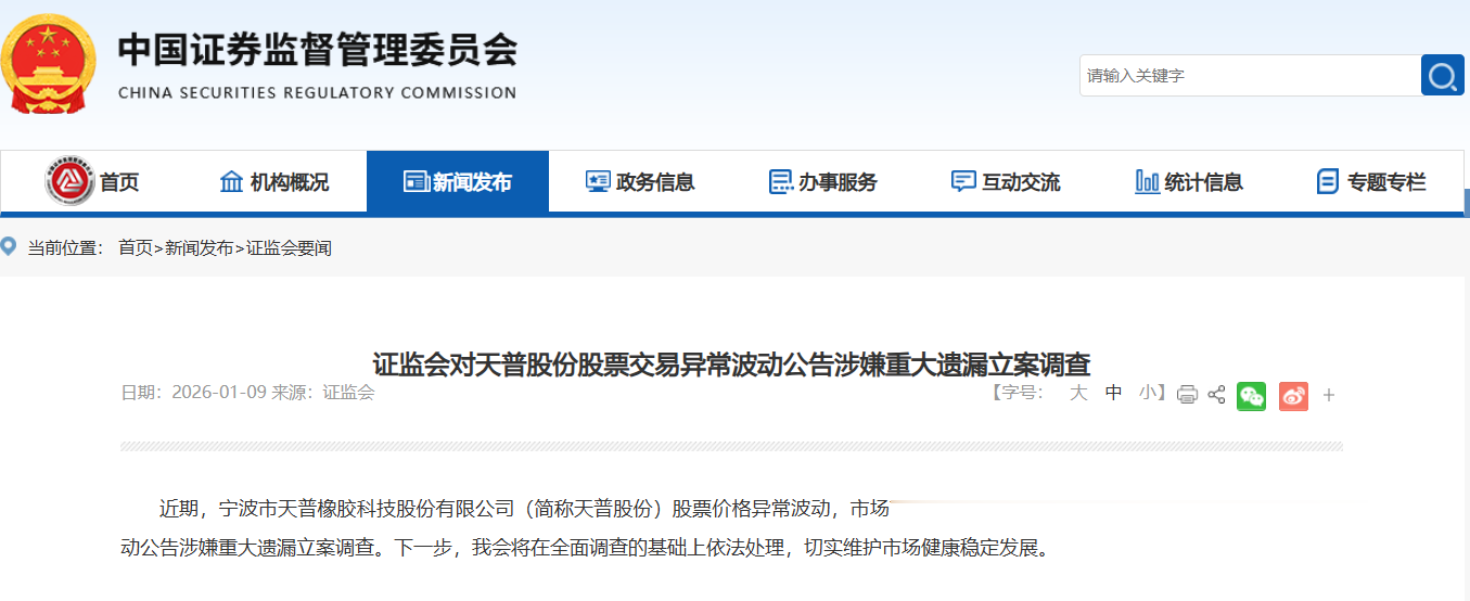 1月9日,证监会官网发布公告,近期,天普股份(605255.SH)股票价格异常波动,市场高度关注。近日,我会已对天普股份股票交易异常波动公告涉嫌重大遗漏立案调查。