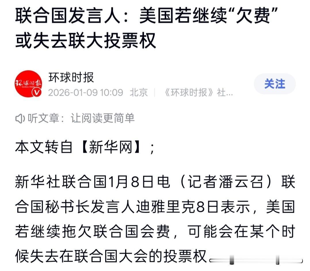 联合国急了,对美下了最后通牒,如果继续“欠费”或失去投票权,这招能奏效吗? 联合国发言人1月8日表示,若美国再不缴纳会费,联大投票权恐怕真要不保。这绝非危言耸听,因为《联合国宪章》第十九条有着明确规定,会员国连续拖欠几年会费便自动丧失投票权。 美国目前欠费约15亿至28亿美元,具体数额说法不一,反正是一笔巨款。欠费主要集中在常规会费和维和费用上,美国一直拖欠不给。以往他们以财政年度不同为借口,如今看来是要把钱当作筹码,妄图让联合国听命于己。 而中国已缴清2025年的全部会费,共计6.8亿多美元,一分没少。联合国副发言人还特意用中文表达了“谢谢,中国”。中美两国的做法形成了鲜明对比。 联合国如今确实资金紧张。据法新社报道,联合国维和部队将裁减四分之一,工作人员工资也难以按时发放。长此以往,联合国恐将无法正常运转。 倘若美国真的失去投票权,只能坐在会场却无法发言,那可就颜面尽失了。但美国向来如此,临近红线才补交一点,这次也不知是否会动真格。 联合国宪章 联合国费用