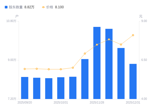 日期A股户数(户)流通A股户均持股数(股)户均持股市值(万元)2025-12-318823511338.129.182025-12-199559010465.737.852025-12-101044489578.157.502025-11-281053469496.507.112025-11-209046511058.637.652025-11-108229812156.057.312025-10-318204312193.847.212025-10-108163412254.937.242025-09-308181712227.527.262025-09-208220412169.957.22