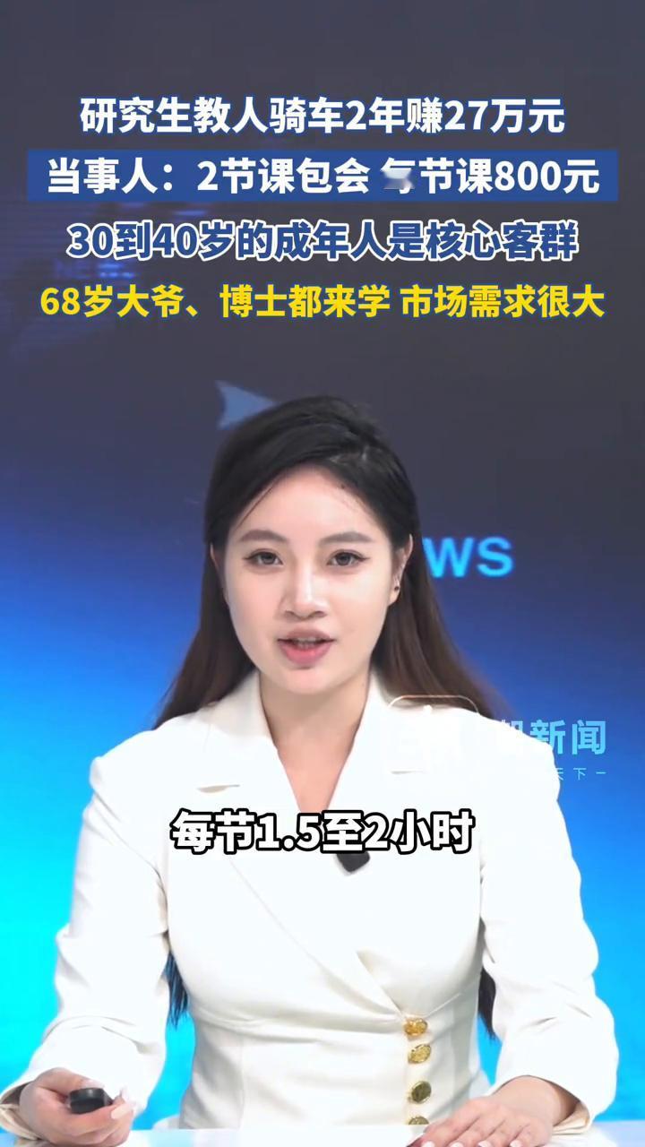 研究生教人骑车2年赚27万元。当事人:2节课包会,每节课800元。 68岁大爷、博士都来学,市场需求很大。研究生教人骑自行车2年赚27万,30到40岁的成年人是核心客群。 据封面新闻1月8号报道,上海体育大学研三学生小李上门教成人骑车,累计收入27万元,教授学员近700人。小李透露课程2节课包会,每节1.5至2小时,总收费800元。有的学员是公司骑行、团建临时学习,甚至有68岁老人、博士群体慕名而来,只为弥补童年遗憾。 教学时前10分钟讲解刹车、座椅调节等理论,其余时间全是实操。小李表示学会和骑好是两回事,标准是能在空旷场地随意起步、刹车、转弯。学练自行车 青少年学自行车 自行车教学培训 零基础学自行车