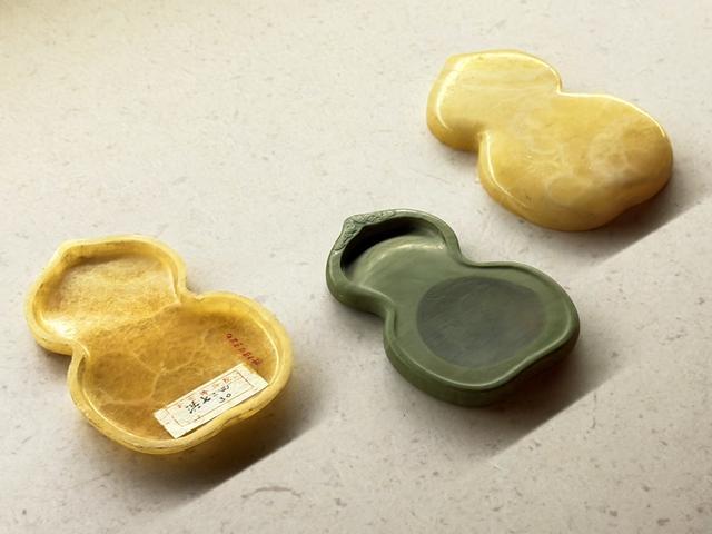 雍正年间的砚台尽显制砚工艺之精巧,其中两件展品尤为夺目。松花石葫芦式砚线条流畅,形似葫芦的形制暗藏“福禄”谐音,砚盒以黄色叶蜡石或软玉雕琢而成,与绿色砚台形成鲜明对比,更显雕工精湛。另一方松花石双桃式砚则别出心裁,砚面随形雕作葫芦状,砚缘雕刻枝蔓,黄色松花石砚盒借俏色雕出桃果枝叶,将葫芦与桃的吉祥寓意相融。“把两种吉祥纹样结合得这么巧妙,古人的审美太绝了。”年轻观众张倩文凑近展柜,细细端详着砚台,忍不住和同伴分享感受。