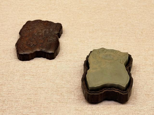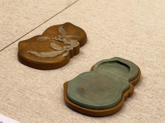 另一侧,出自乾隆年间的松花石树式砚也备受关注。砚盒为紫檀所制,因乾隆皇帝喜爱紫檀,宫中器物多有此材质身影,紫檀与松花石砚身搭配,彰显雅致格调。几位文博爱好者围在展柜前,低声讨论着紫檀木的纹理与质感,感慨皇家器物选材的考究。