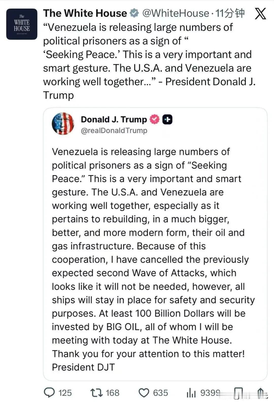 ‘特朗普:委内瑞拉正在释放大量政治犯,以此作为“寻求和平”的标志。这是一项非常重要且明智的举措。美国与委内瑞拉正通力合作,尤其是在涉及以规模更大、更完善、更现代化的方式重建双方的油气基础设施方面。由于这种合作的存在,我已取消了原先预定的第二波攻击行动。目前来看,似乎已不再有必要采取此类行动。不过,所有船只仍将停留在原位,以确保安全与稳定。BIG OLL将至少投入1000亿美元资金,所有相关人员我将于今日在白宫与其会面