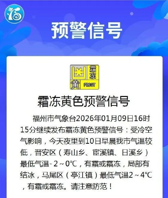 福州发布霜冻黄色预警