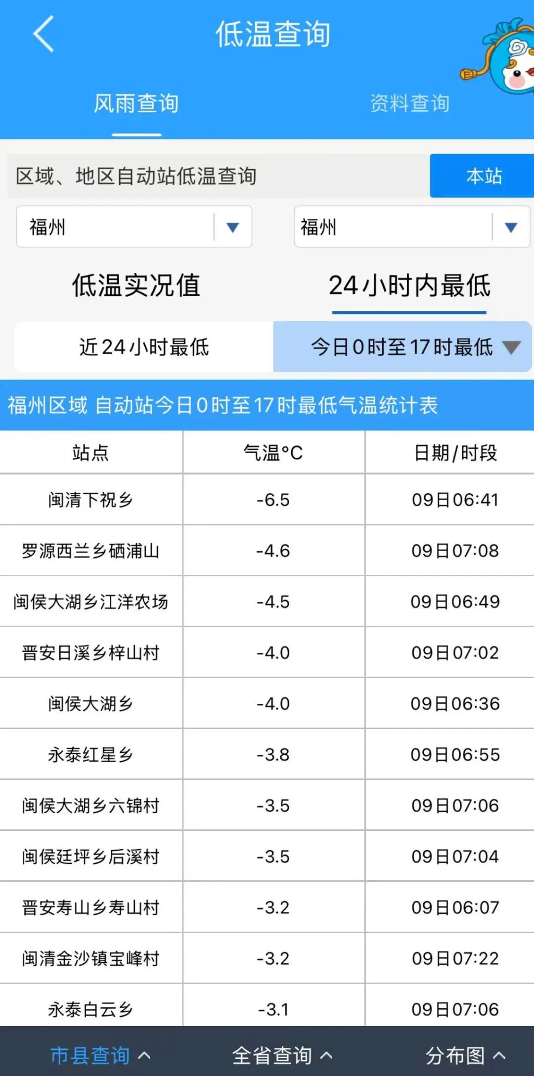 今天福州区域最低温