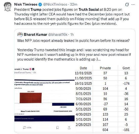 “美联储传声筒”NickTimiraos转发一位网友的贴文并表示:特朗普总统于周四晚间8点20分在“真实社交”平台发布了就业数据。彼时,白宫经济顾问委员会(CEA)理应已拿到12月就业报告,但劳工统计局(BLS)尚未在次日上午将该报告公之于众。而特朗普发布的这些数据,与结合了修正值的未公开12月就业数据完全吻合。