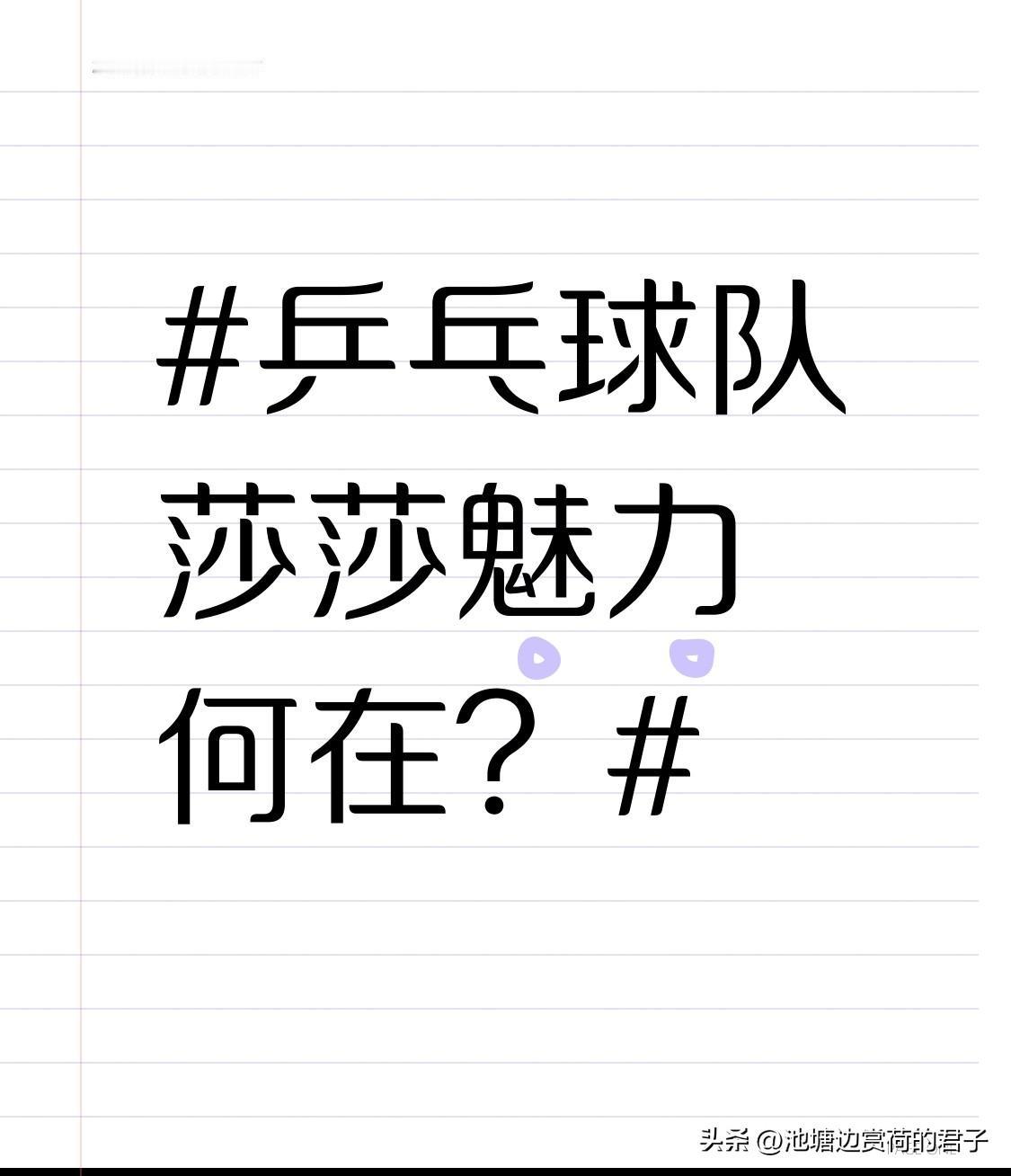 孙颖莎的魅力真的很难挡!作为一名乒乓球业余爱好者,我以前对队员无感,这几年却被她深深吸引。 她的竞技实力超强,打球风格极具辨识度。正反手均衡,正手暴冲力量大、落点刁,看她比赛能感受“力量美学”。赛场上她干脆利落,有“大将之风”,关键分果敢,大心脏。无数次落后或僵持时,她都能敢于出手,逆转比赛,把伊藤美诚都打自闭了。 而且她极具人格魅力,特别有亲和力,善于跟人打交道。她打破了传统对女孩的定义,展现出女性魅力的更多面,引导着更多女孩子走向美好。这样的莎莎,谁能不爱呢?